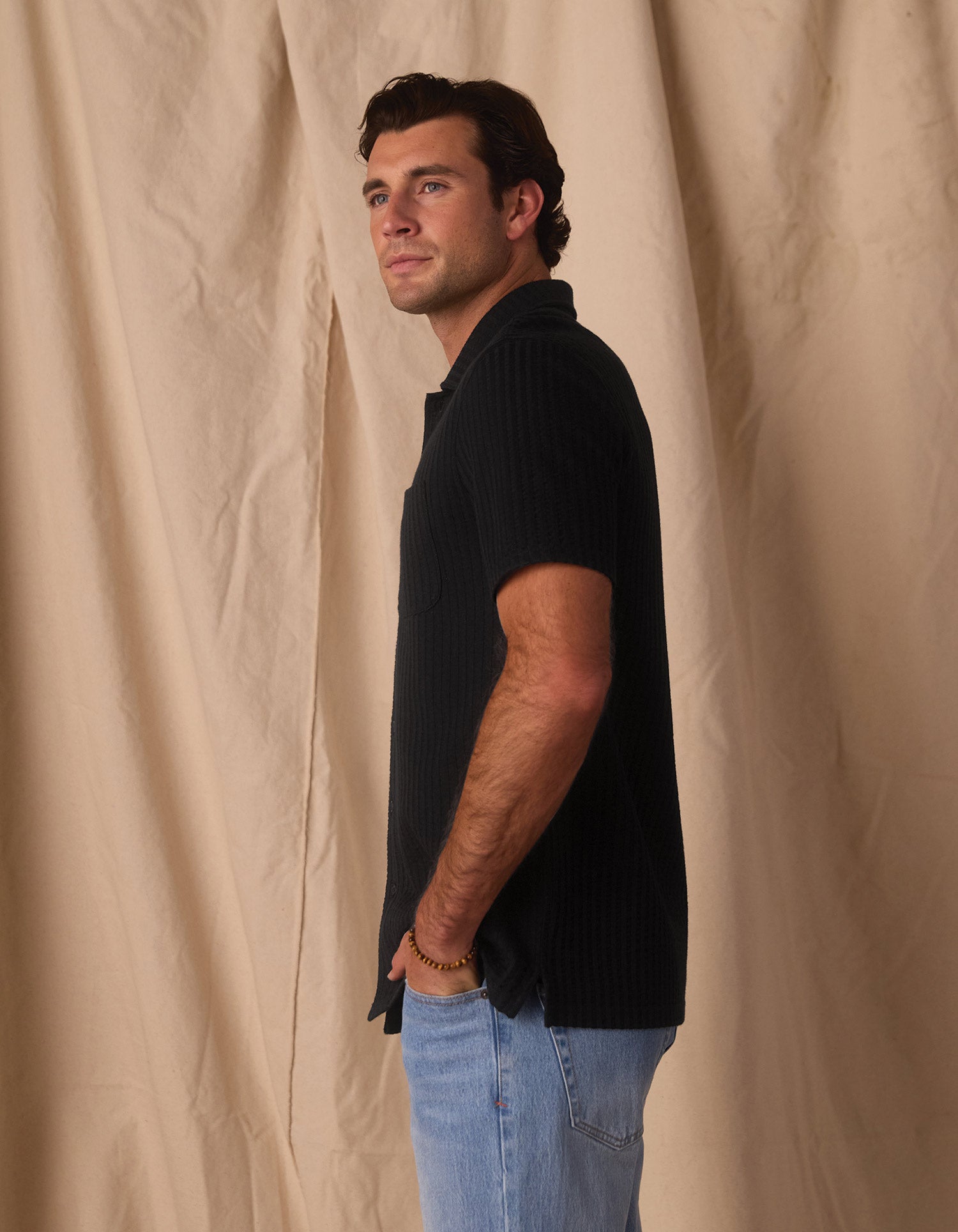 The most comfortable button up in your closet. Featuring textured vertical stripes with a subtle pucker effect, the midweight design makes it perfect for light layering. Complete with two chest pockets, side slits, and buttons dyed to match, this button-up is the versatile addition your wardrobe needs this summer.
