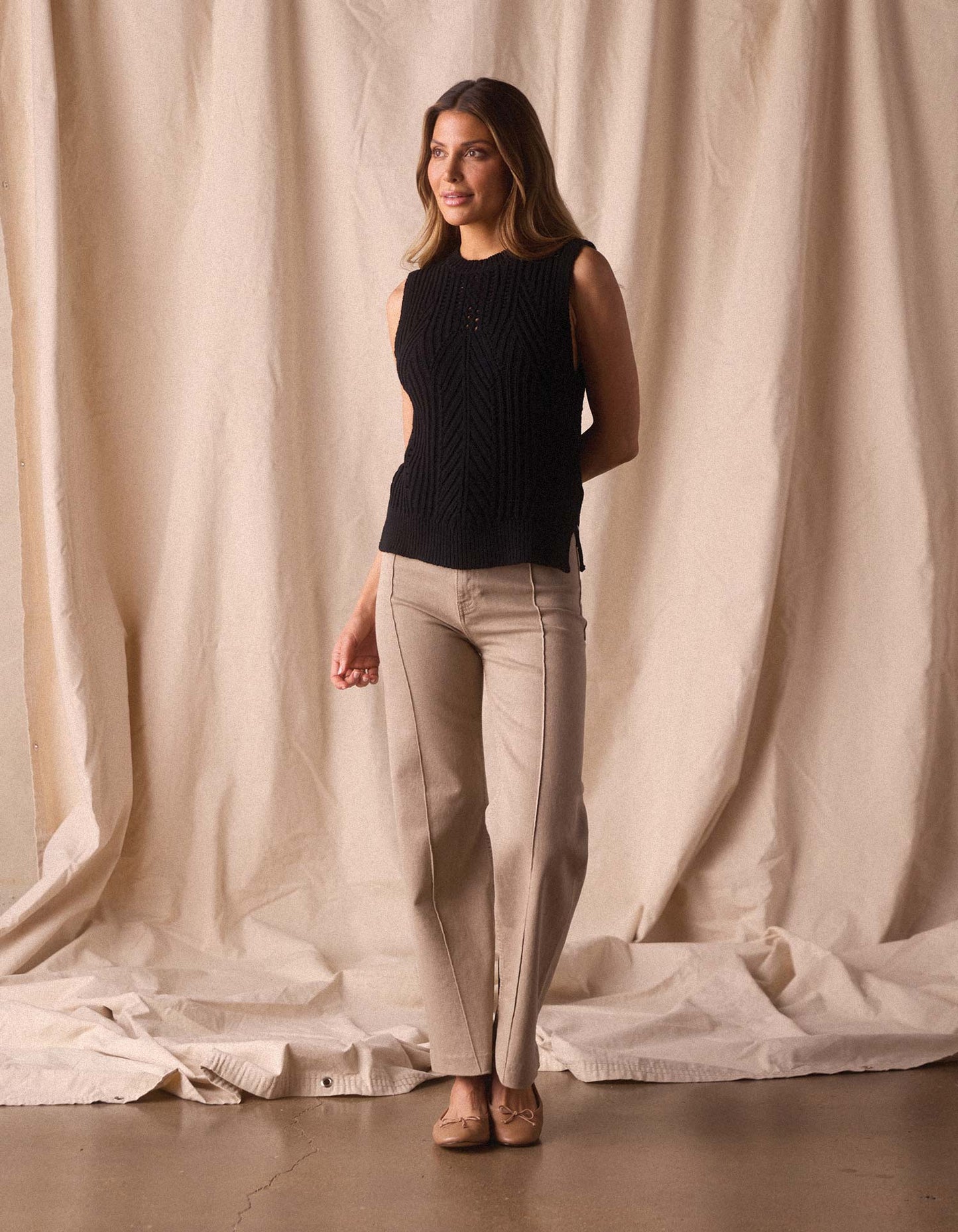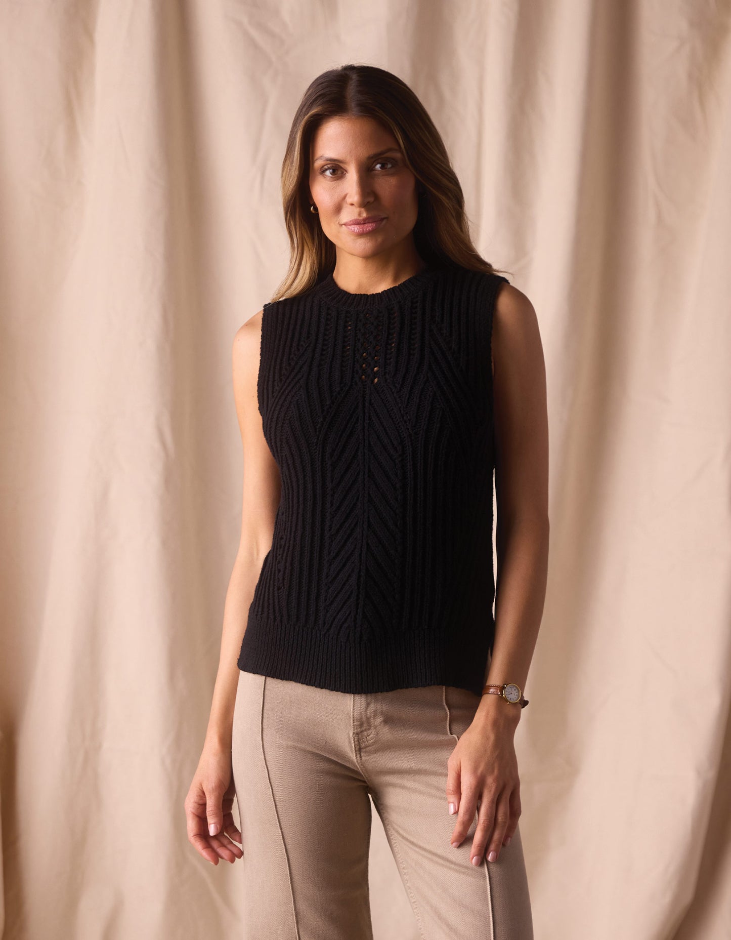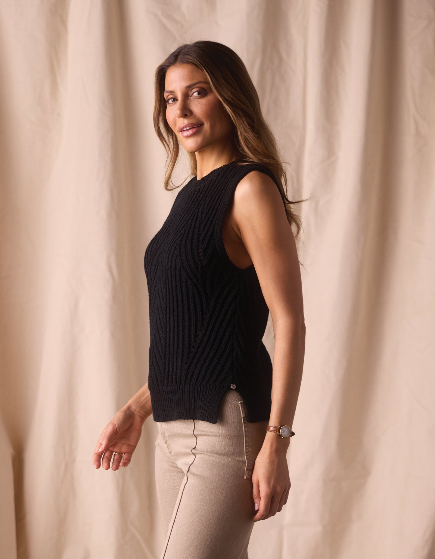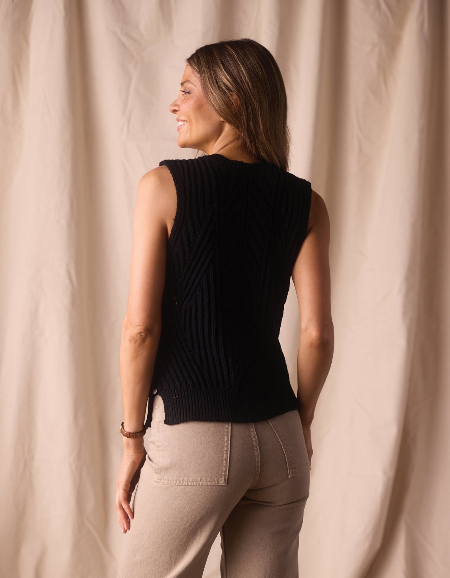 The Adelaide Knit Hi-Neck Tank is crafted from 100% cotton tape yarn in a chunky knit that feels substantial yet breathable. It features an engineered stitch pattern with texture, dimension, and a flattering design, along with a high neckline and rib finishes at the neck, armholes, and hem. Side slits add ease and movement, while a branded metal circle at the hem gives it a signature touch.