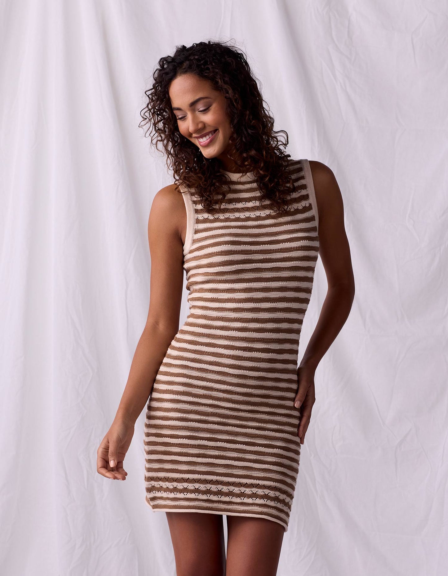 This is a playful and subtly textured piece made from 100% Cotton in a 9 gauge knit with horizontal stripes. It fits true-to-size with a mini length, and features an all-over novelty stitch. The dress includes a rib jewel neckline, rib armholes, and a self-finished skirt. A branded metal bar detail completes this stylish and versatile mini.