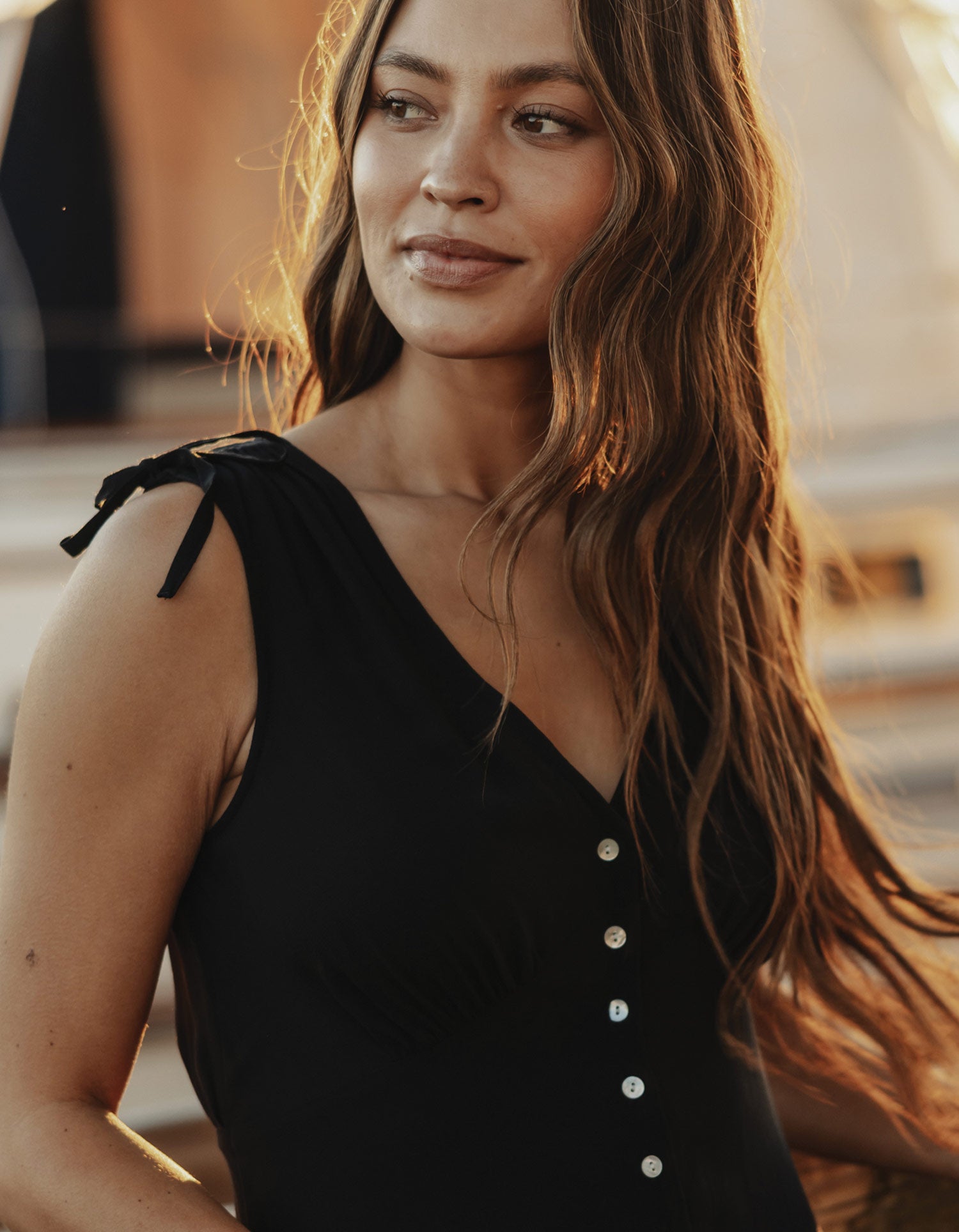 The Aria Crepe Camille Button Thru Mini Dress brings a soft, lightweight feel that transitions effortlessly from daytime to evening. Made from 100% viscose with a softener wash, it drapes gently for all-day comfort. The true-to-size mini silhouette features a shaped waist seam with slight shirring under the bust and at the back waist, creating a flattering fit. Details include a front button placket with mother of pearl buttons, shirring at the shoulders with fixed ties, and a slight A-line skirt.