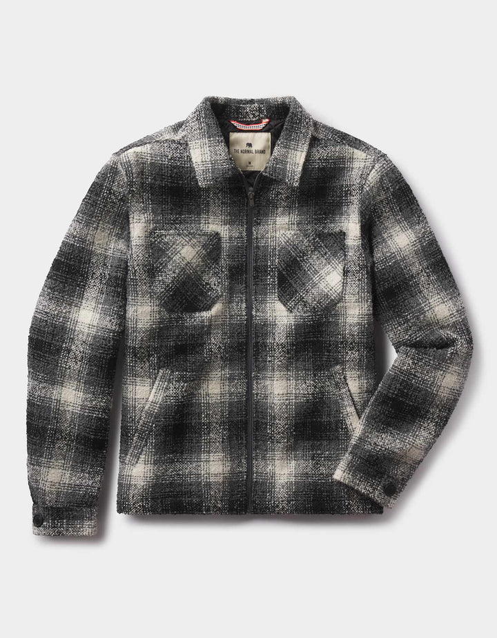 Features a textured woven plaid fabric with a unique yarn slub texture for visual interest. It has a quilted polyester lining, and fits true to size. Details include a convertible collar, full front zip, and two chest pockets cut on the bias. Also features sleeve cuffs with vents, welt body pockets, and an inside cell phone pocket.