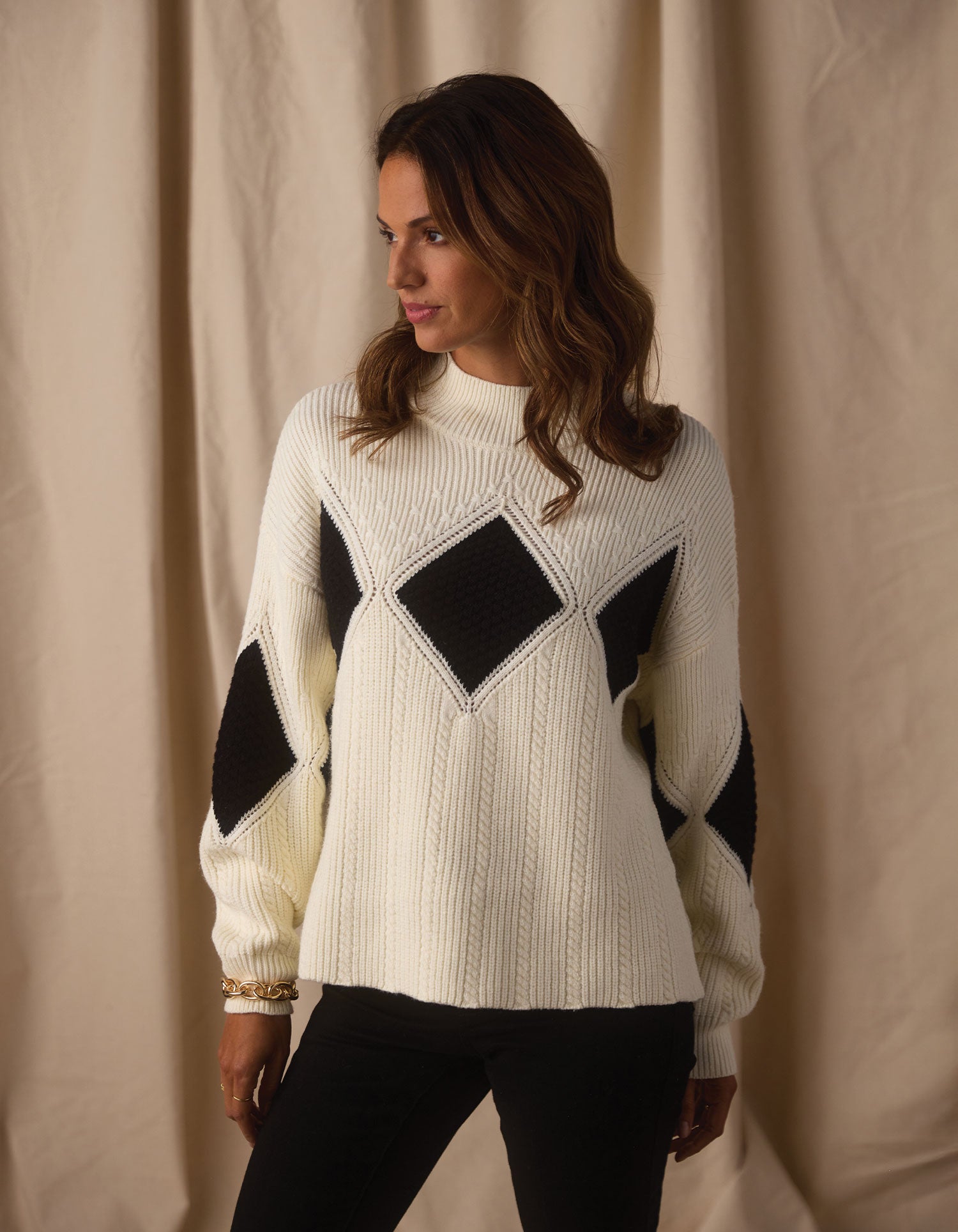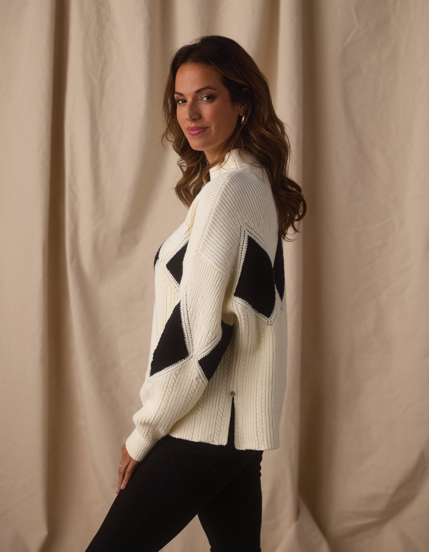 The Celeste Sweater is cozy, comfy, and full of classic charm. Knit in a medium-weight argyle pattern, it blends acrylic, nylon, and merino wool for a soft feel with just a touch of fuzzy texture from the wool. The oversized fit, mock neck, dropped shoulders, and hem with side slits give it a laid-back feel that’s perfect for cooler days.