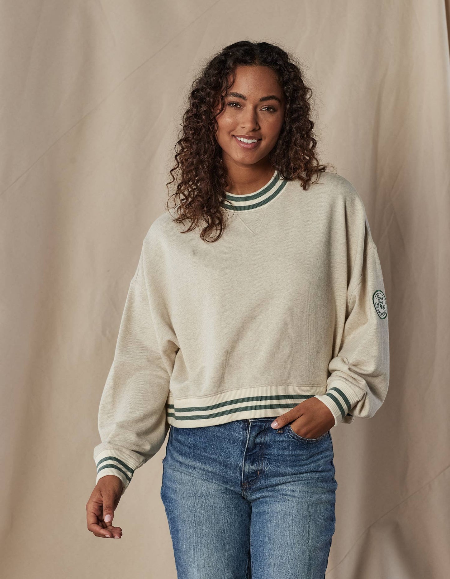 This sweatshirt features collegiate-inspired striped rib band details to create that perfect feeling of nostalgia, calling back camp days with a novelty patch on the wearer's left bicep. Crafted from our plush Cole Terry fabric, it offers a luxurious feel and oversized fit with dropped shoulders.