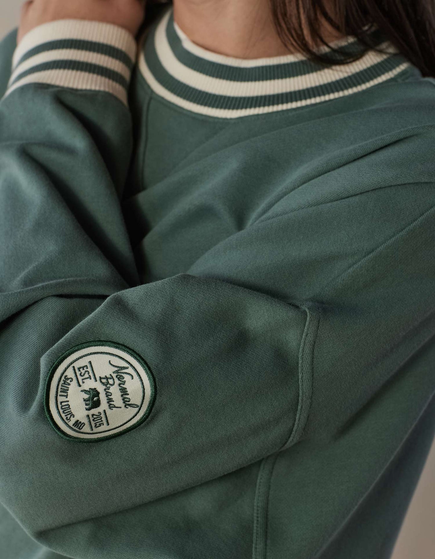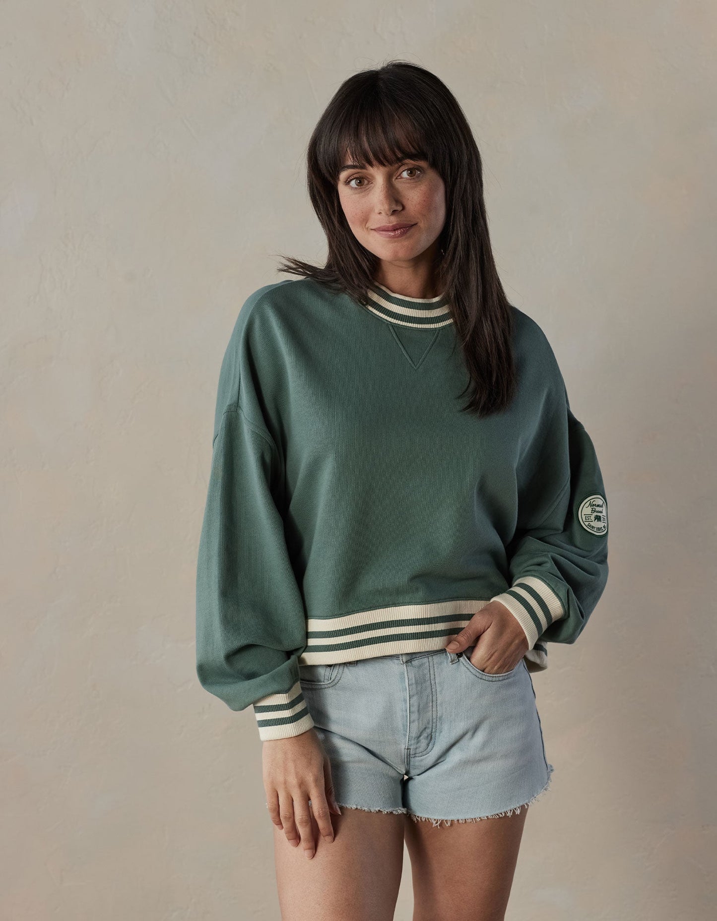 Novelty contrast rib neck, sleeve cuffs, and bottom band. Dorito inset at neck. Double needle coverstitching. Slight hi-low hemline. Balloon sleeve with dropped shoulder. Camp patch at wearer's left bicep.
