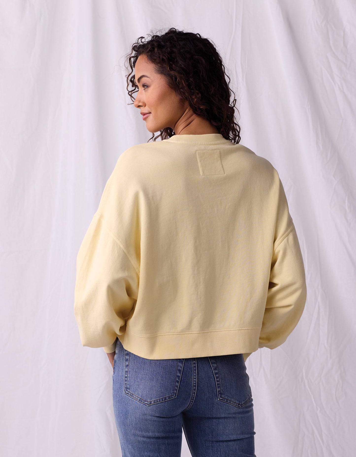 The Cole Terry Vintage Crewneck is an oversized sweatshirt that hits at mid-length made from a terry fabric blend of 84% cotton and 16% polyester. With a smooth face, soft looped backing, and stretch, it is made for comfort. Key features include a rib neck inset with a classic dorito detail, double needle coverstitching, and a slight hi-low hem with a rib band. The balloon sleeves with dropped shoulders and rib cuffs add a relaxed, vintage-inspired touch to this versatile crewneck.