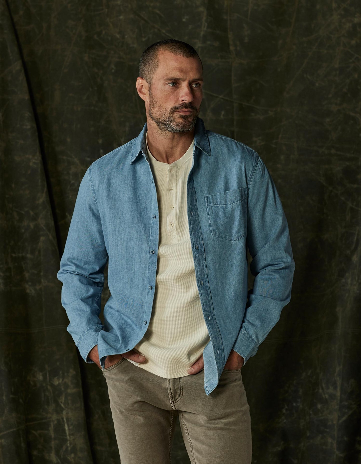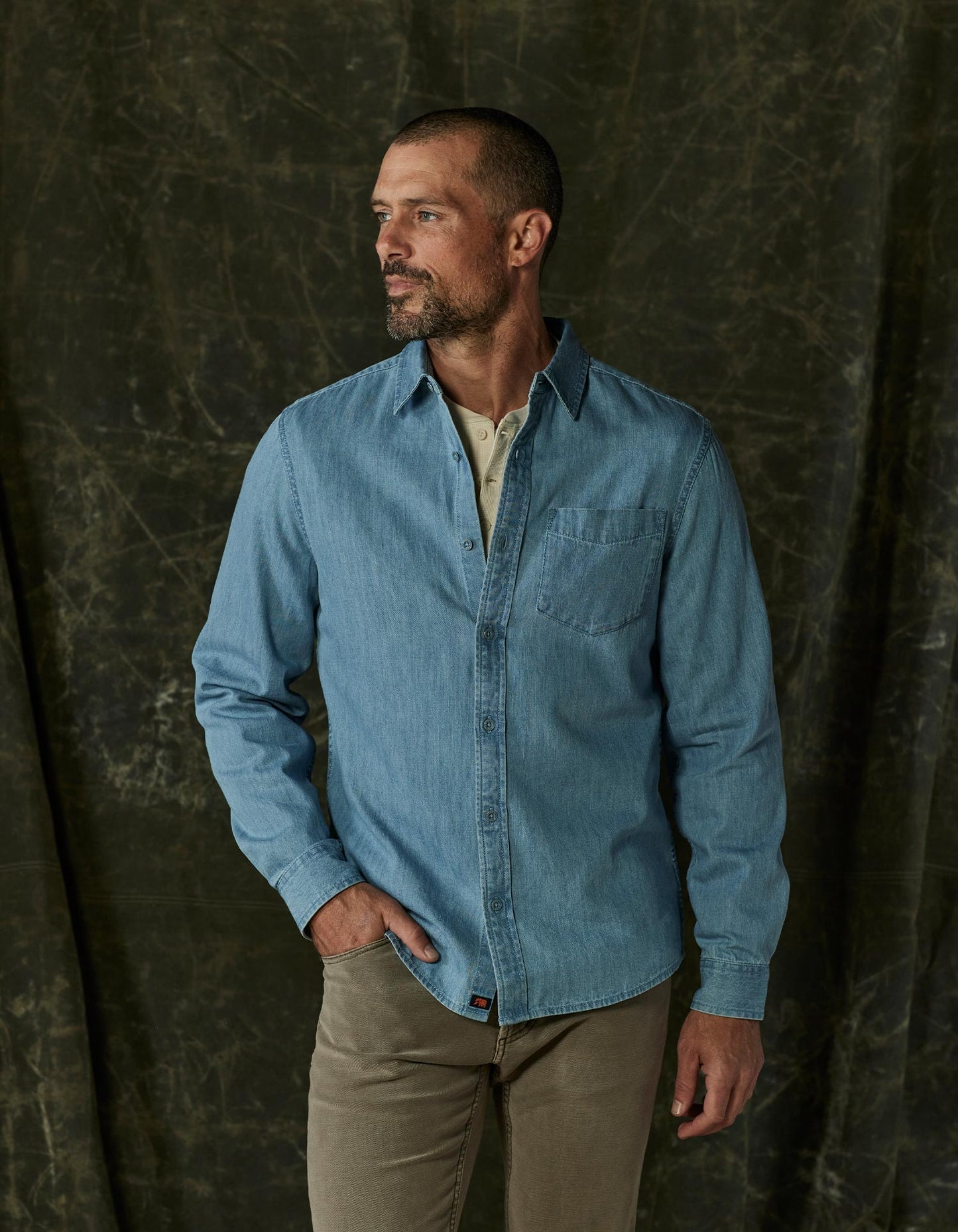This button up is a true-to-size shirt crafted from soft, drapey Cotton denim that's as lightweight as you'd want for a Fall style. It features a 2-ply collar and collar stand, adjustable sleeve cuffs, and a single chest pocket. The back yoke with a box pleat ensures a comfortable fit, while engraved buttons add classic finishing touches.