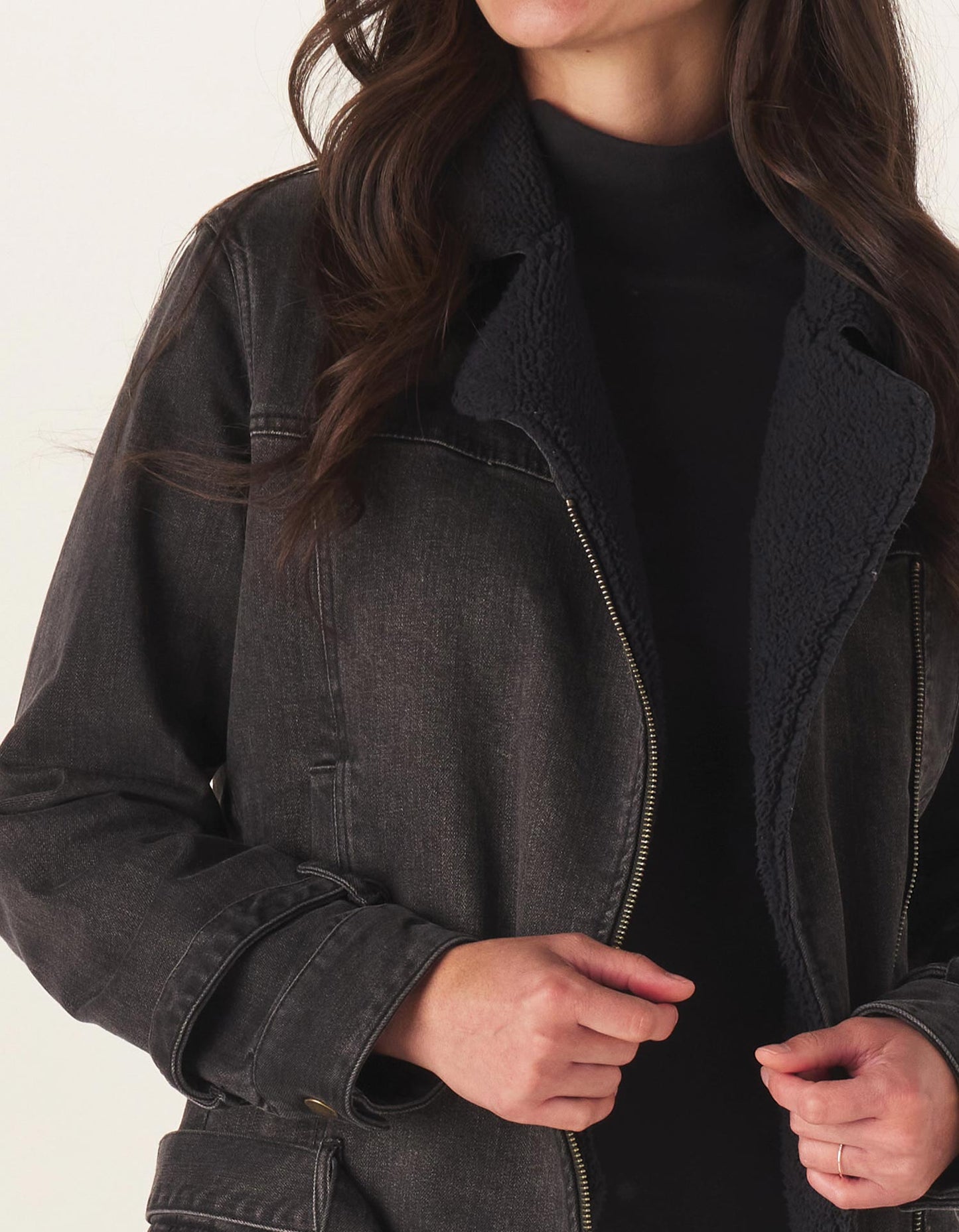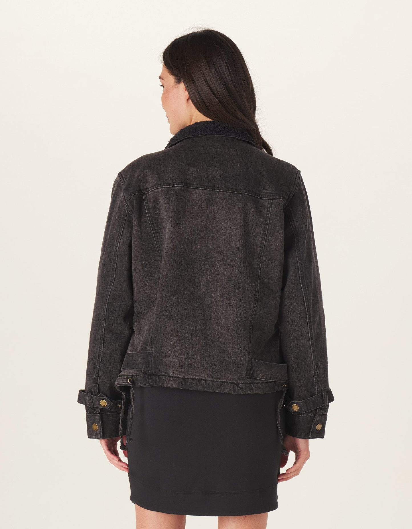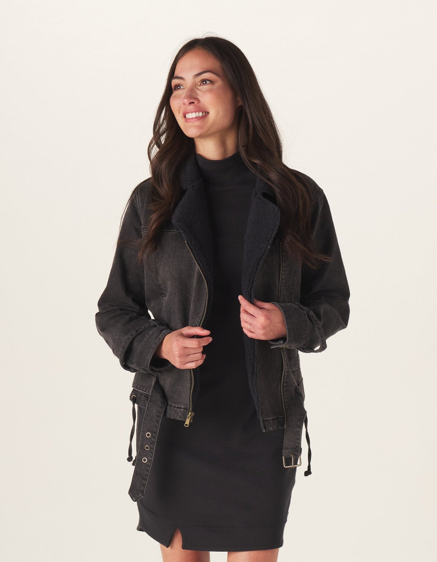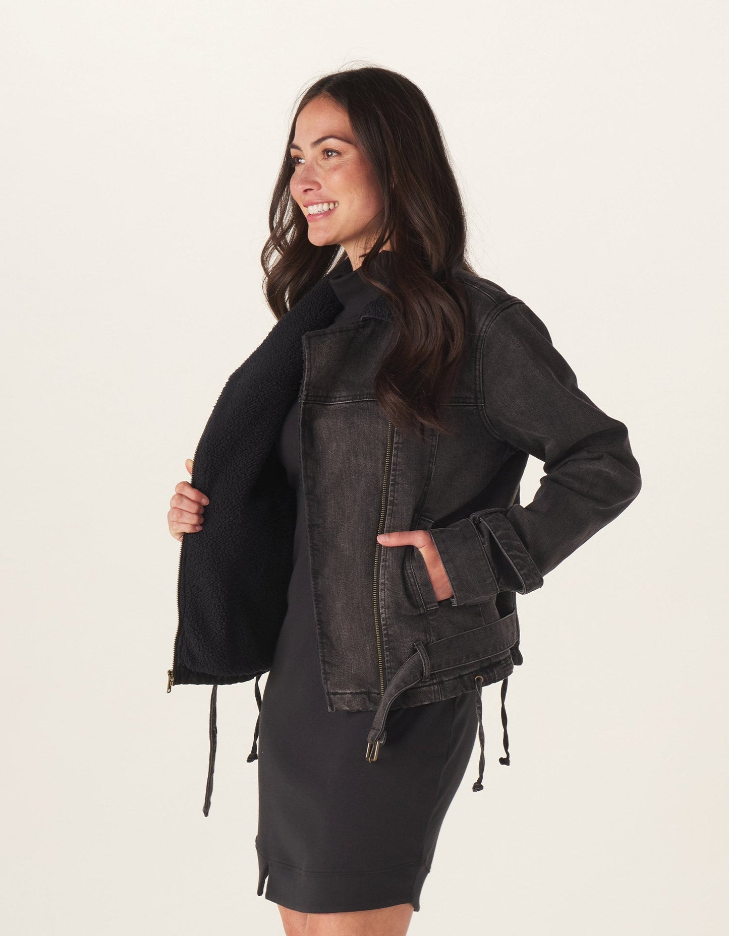 A cozy take on an edgy classic, the sherpa-lined Denim Moto Jacket is warm and soft, with a relaxed fit and a vintage denim wash. Complete with belted accents at the sleeves and waist, it adds instant interest to a basic white tee and jeans combo.