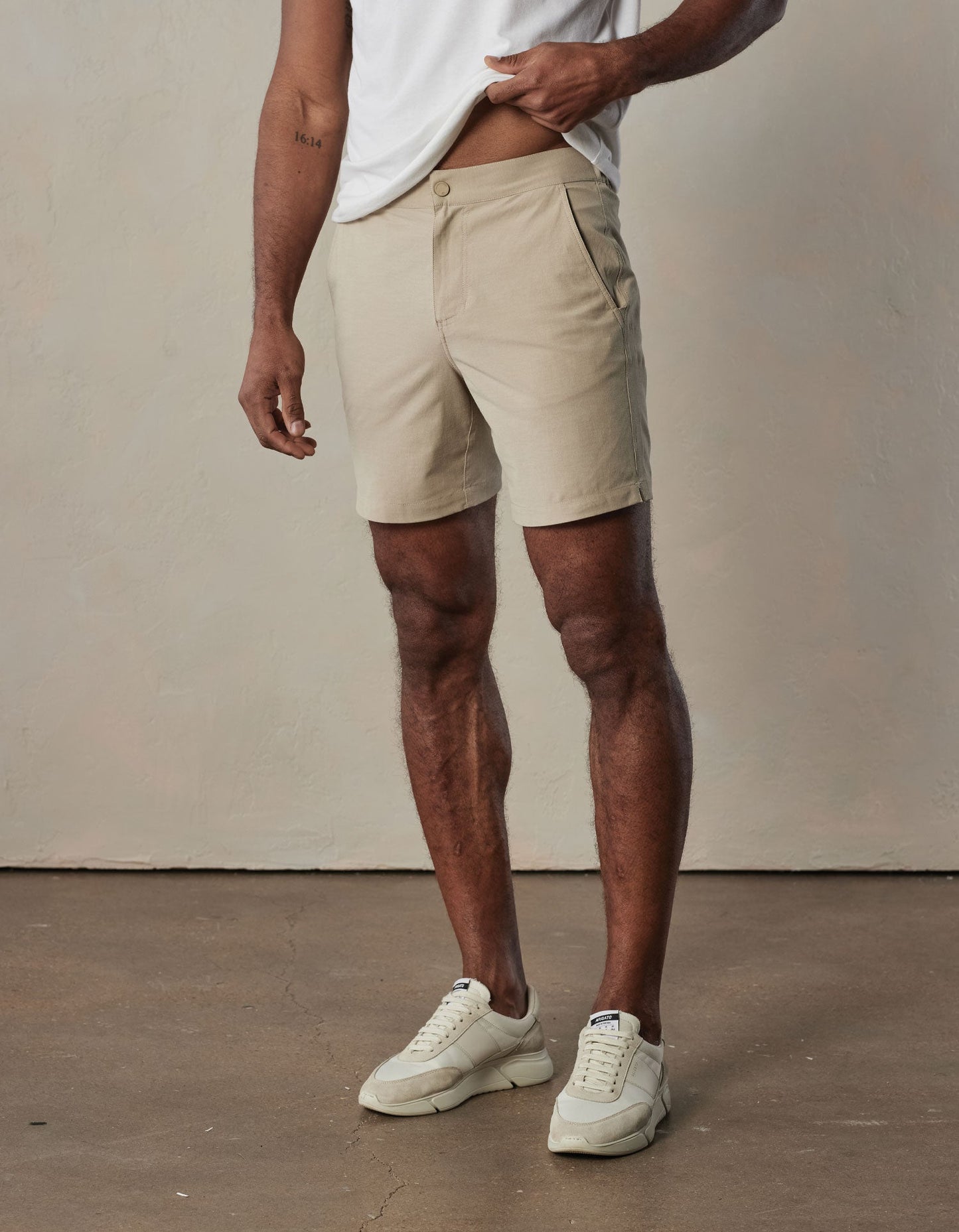 The best of both worlds—soft and breathable like cotton, yet stabilized and with subtle stretch for performance.This lightweight stretch woven fabric is lightly peached for added softness and piece-dyed for a clean, matte finish. Full front zip fly with snap, multiple pockets, and leg opening vents add functionality. With a stylish and true-to-size fit and a comfortable 7" inseam, you'll be grabbing for these all summer.