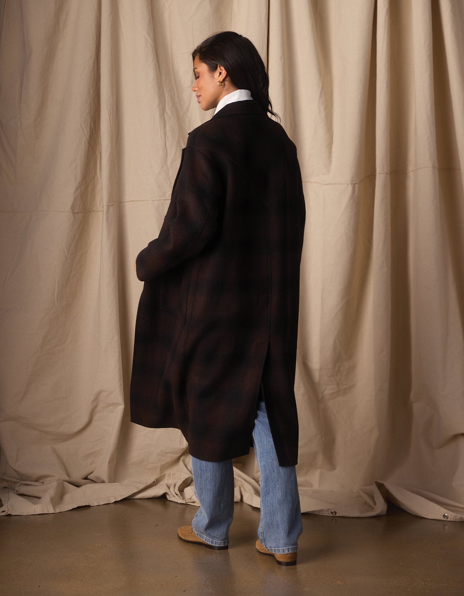 The Duster Coat brings structure and softness together in a double-face wool blend. With a boxy fit and knee-length silhouette, it’s designed for layering without feeling bulky. Finished with clean bonded seams, a notched lapel collar, and asymmetrical patch pockets for a modern touch.