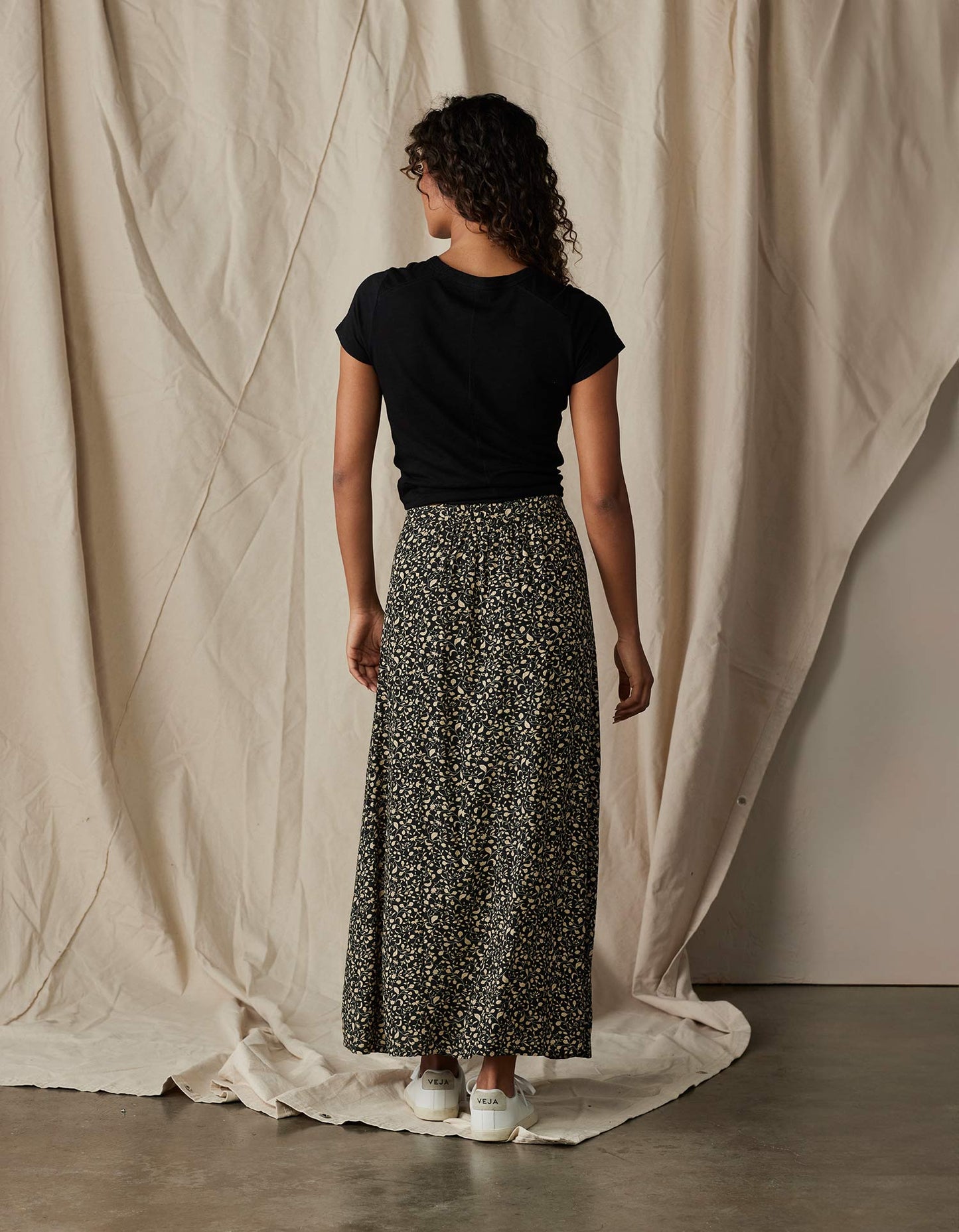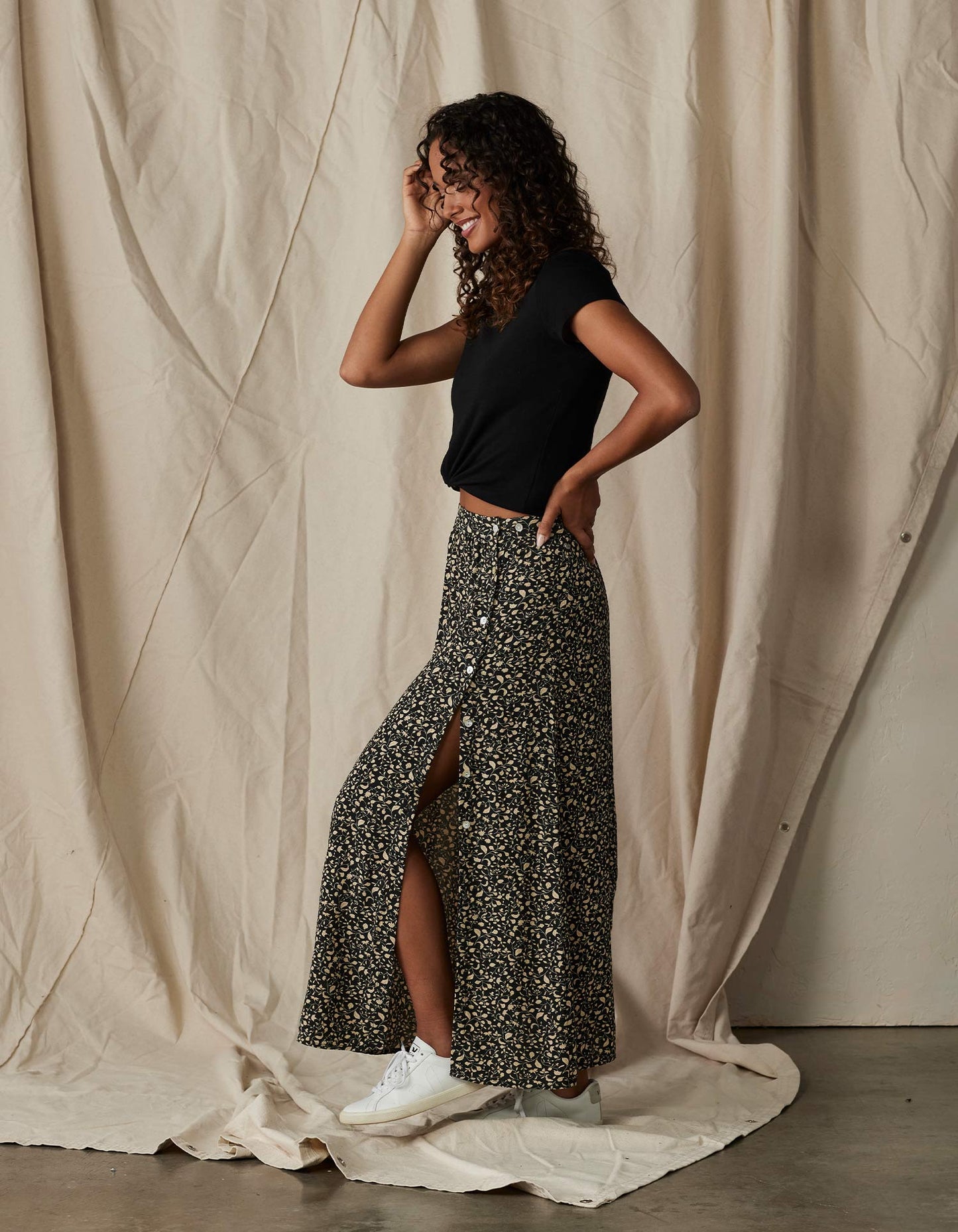 This dreamy skirt is made of 100% viscose, offering a light and drapey feel with a matte plain weave. It features a midi length and a hi-rise fit, with a partial elastic waist for a perfect fit and a function button placket accented by mother of pearl buttons. The A-line silhouette offers a flattering silhouette, perfect for dressing up or down.