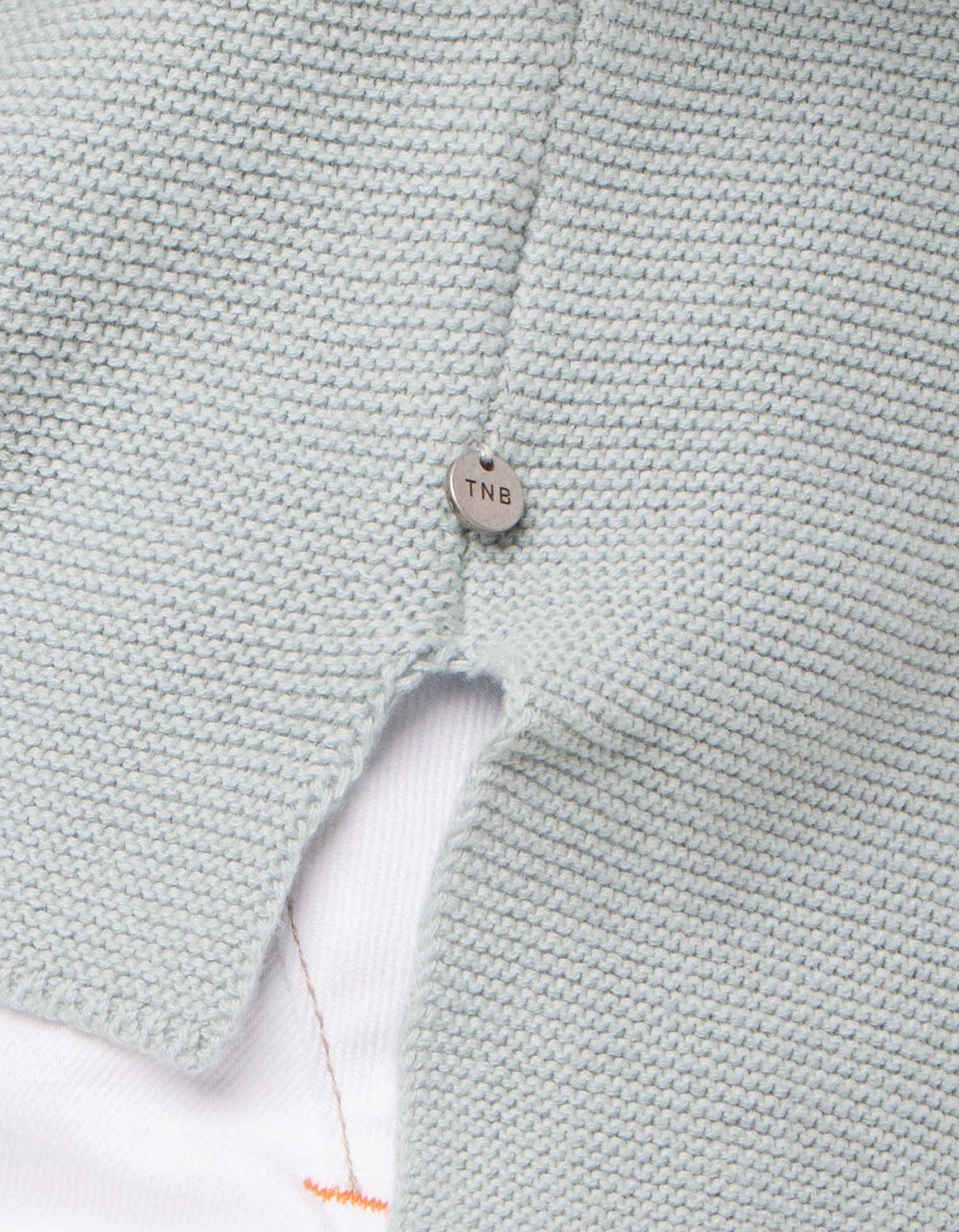 Rib at neck opening and center front button placket. Cute contrast stitch at bottom and sleeve edges. Straight high-low hem with slits. Long sleeves with rolled and tacked cuffs. Engraved metal circle
