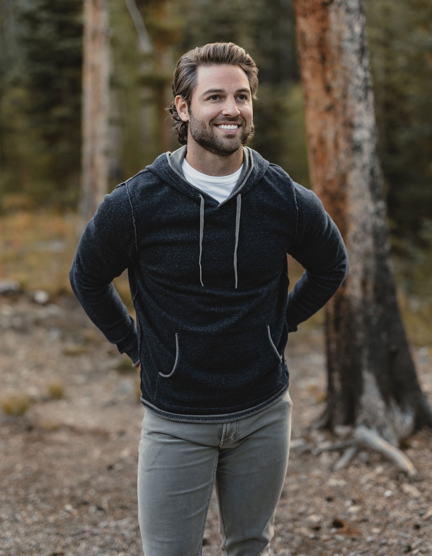 Love this hoodie and this brand. Bought both the black and the navy. They look great with everything and very comfortable.