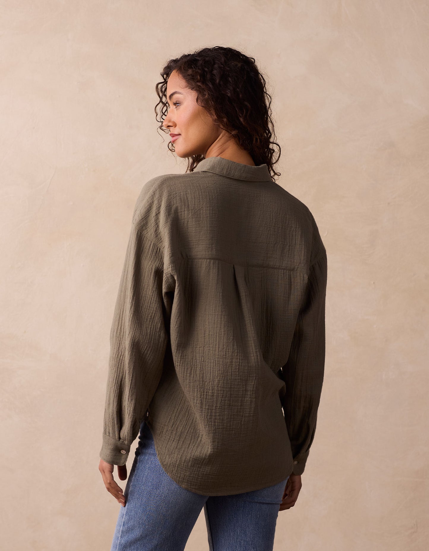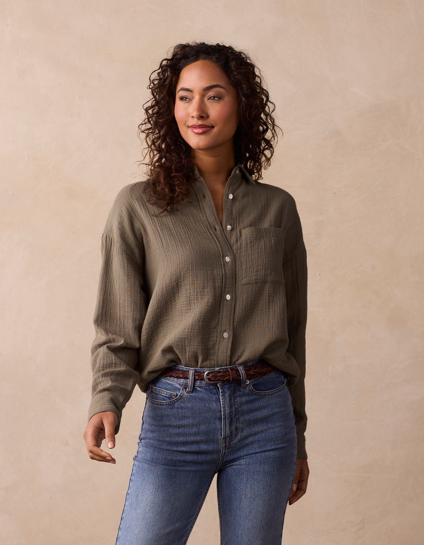 The Kalo Overshirt offers a relaxed, oversized silhouette that hits at the hip. Made from 100% Cotton double gauze with a woven bubble texture, it feels airy and lightweight. Designed with dropped shoulders, adjustable sleeve cuffs, and a full button front, this piece is perfect for layering over tees or tanks. A shirt collar with a collar stand, back yoke with box pleat, chest pocket, and a shirttail hem complete its laid-back style.