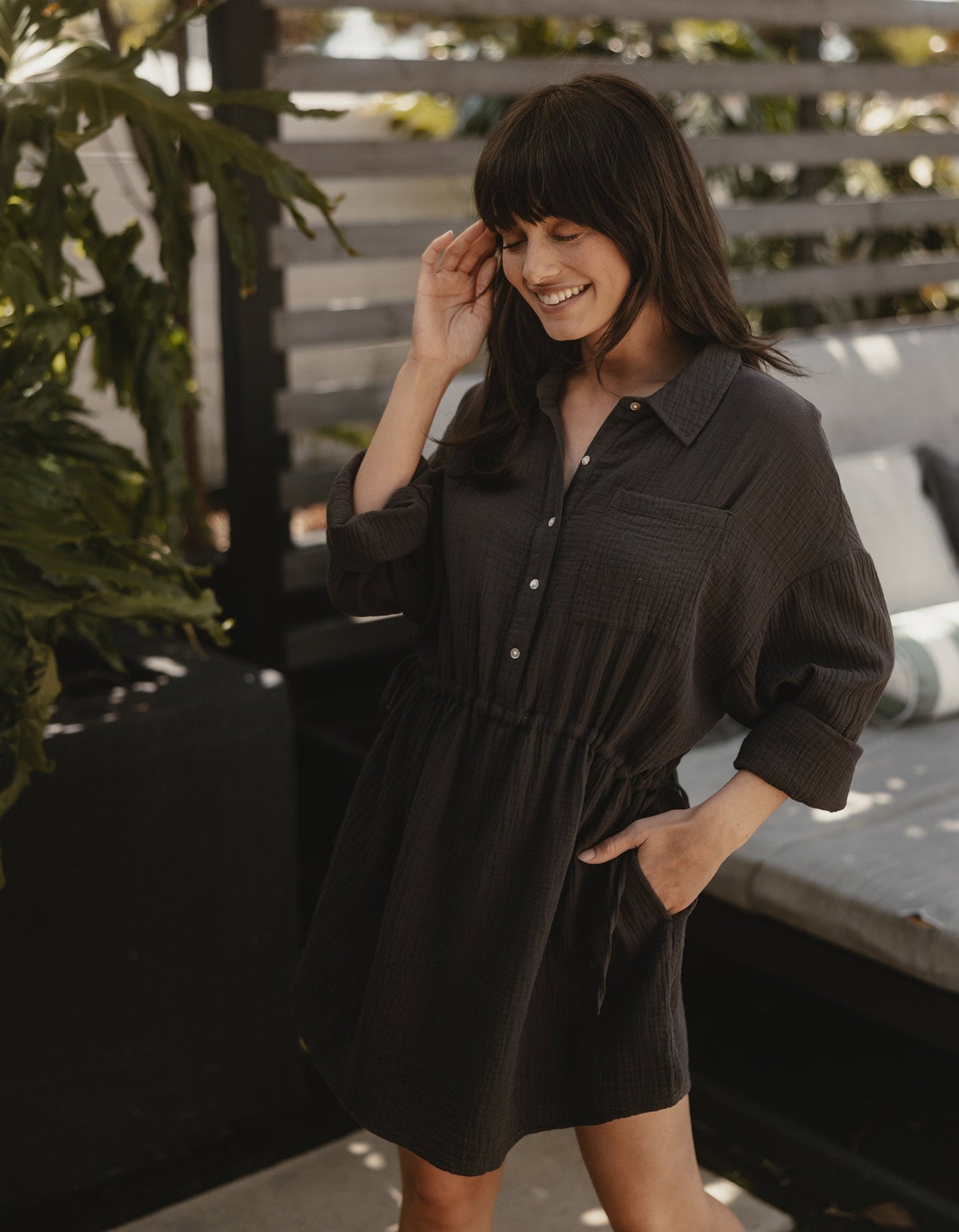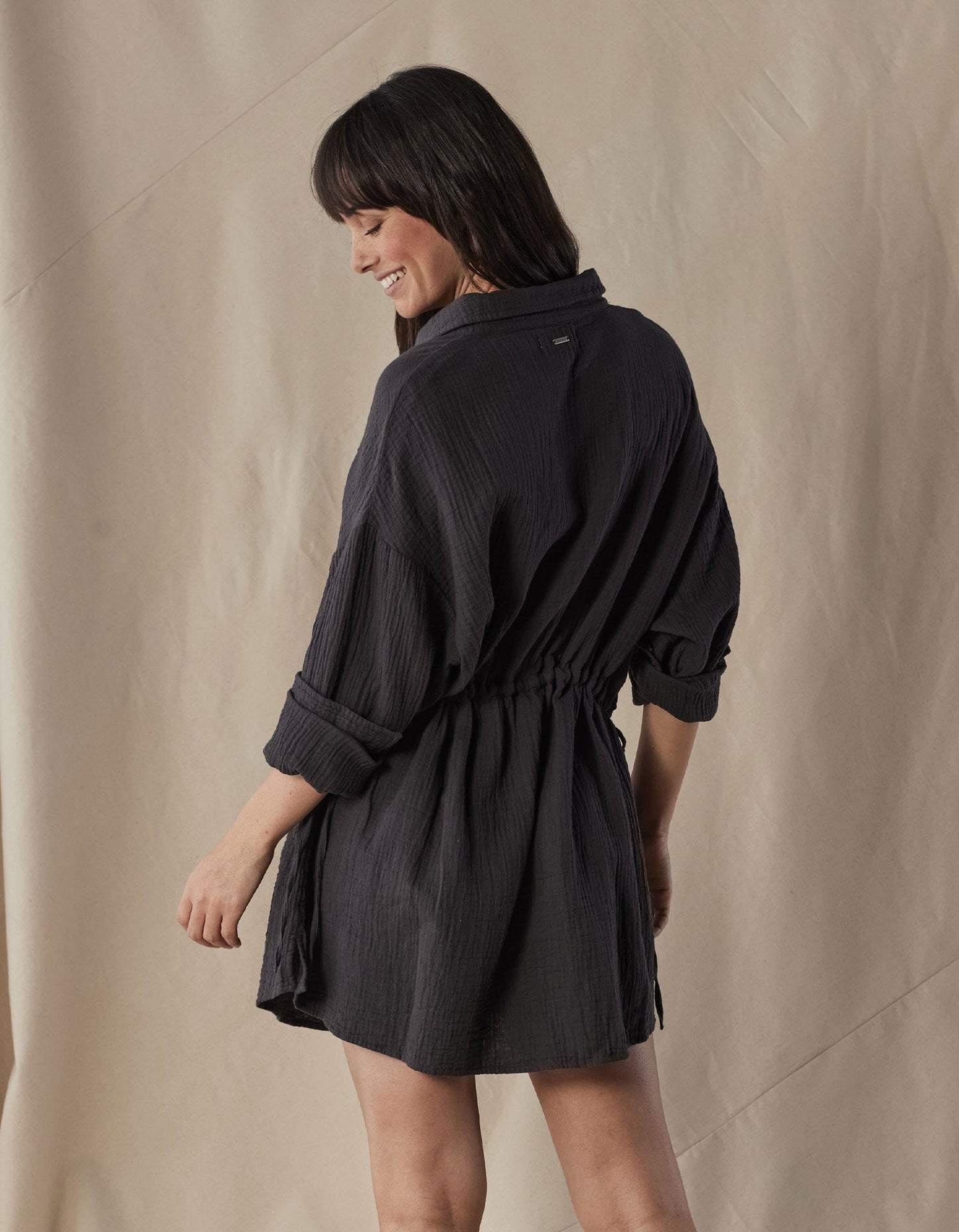 We took the typical shirt dress, made it out of our soft, airy Kalo gauze, and added an adjustable feminine silhouette. Leave the dress uncinched for a boxier, loose look, or tighten the drawstrings to accentuate your waist. The Kalo Shirt dress features a shirttail hem, pearl button details, and major desert siren vibes.