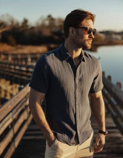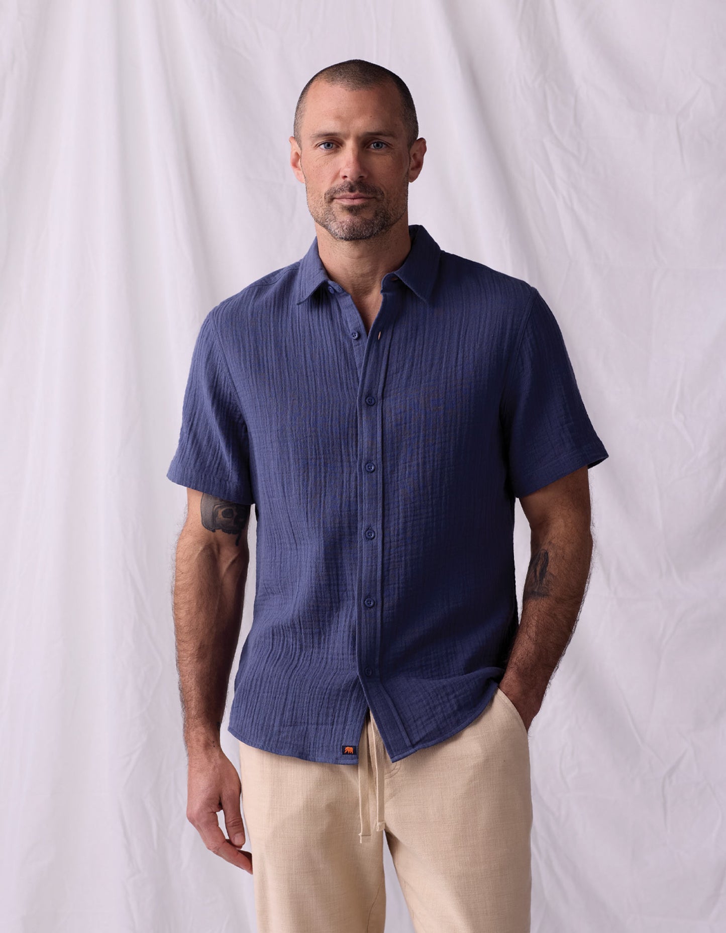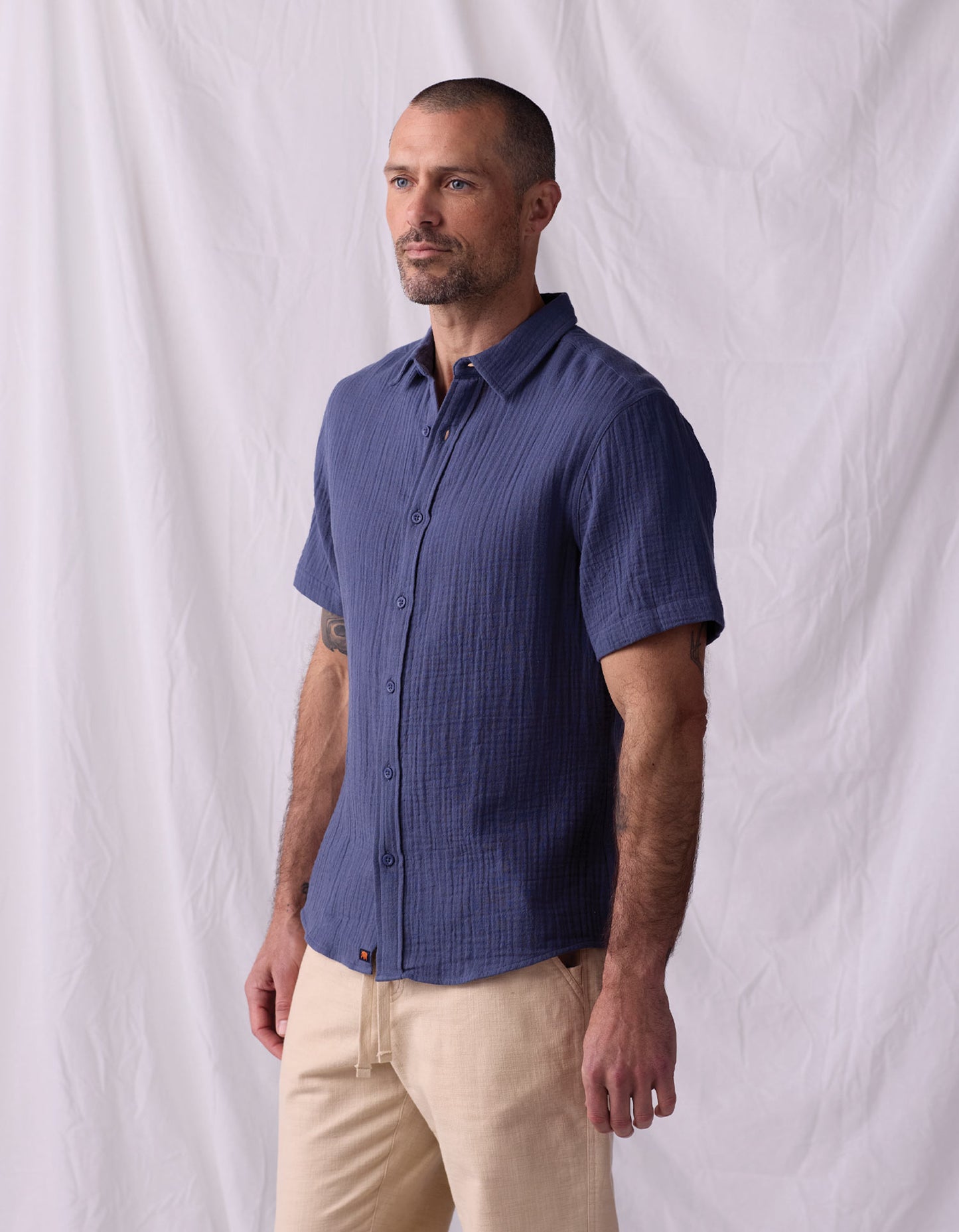 The Kalo Short Sleeve Button Up is a breezy warm-weather essential with a relaxed yet polished look. Made from 100% Cotton double gauze featuring a woven bubble texture, it offers an airy and comfortable feel. The true-to-size fit ensures effortless wear tucked or untucked. Details include a shirt collar with collar stand, full button front, back yoke with knife pleats, short inset sleeves, and a shirttail hem, making this top a versatile choice for laid-back days or casual outings.