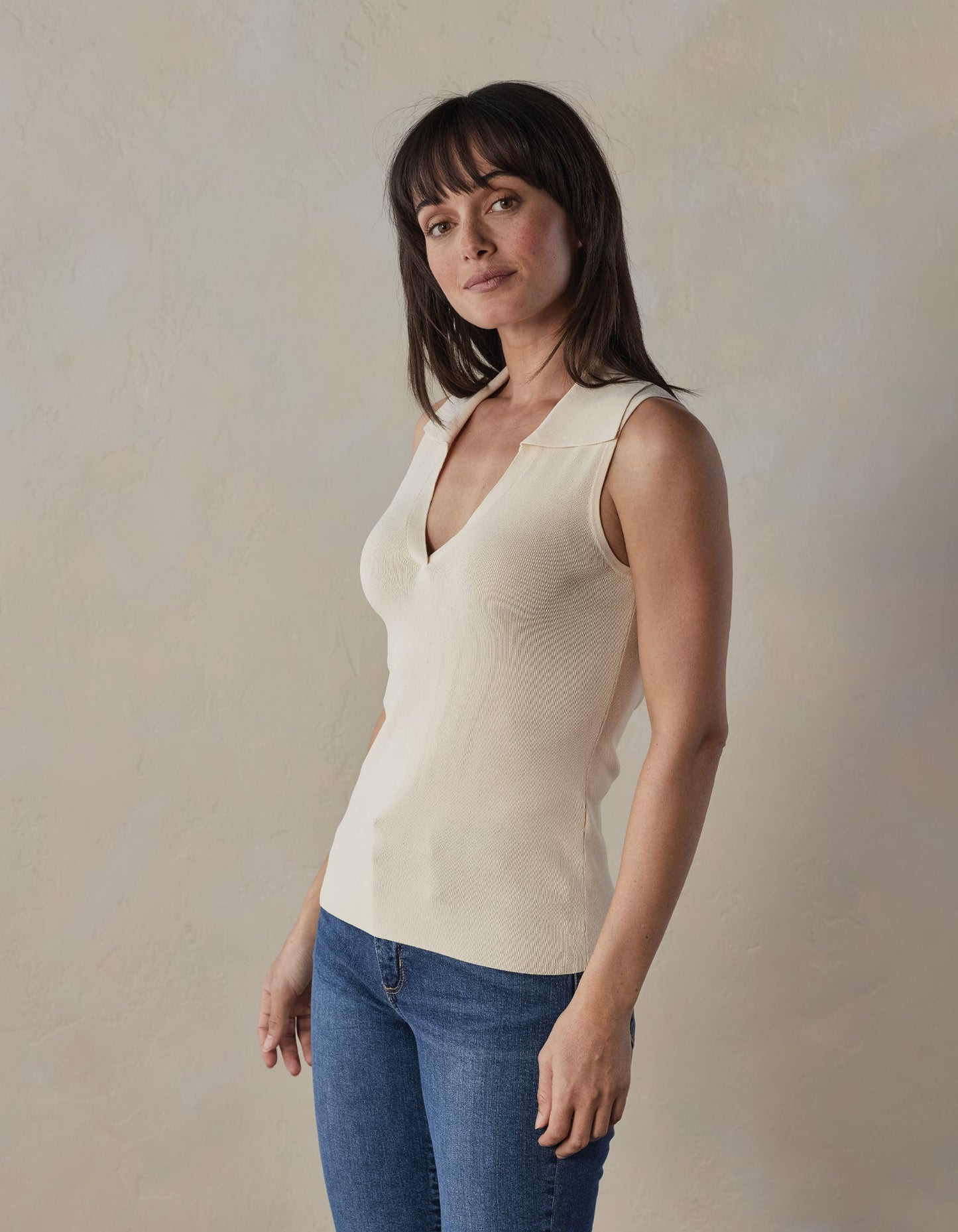 Crafted from a fine yarn with a refined and smooth texture, this polo offers a lightweight feel that's perfect for the season. With a v-neck, exaggerated collar, and a light and smooth feel, it's the ideal choice for warm weather. This fitted, sleeveless polo hits at high hip for a flattering silhouette.