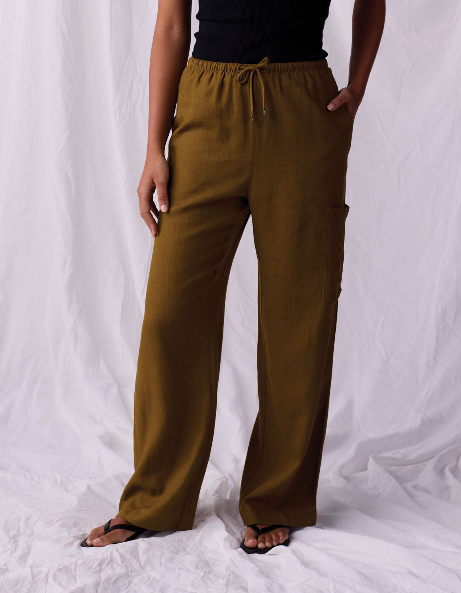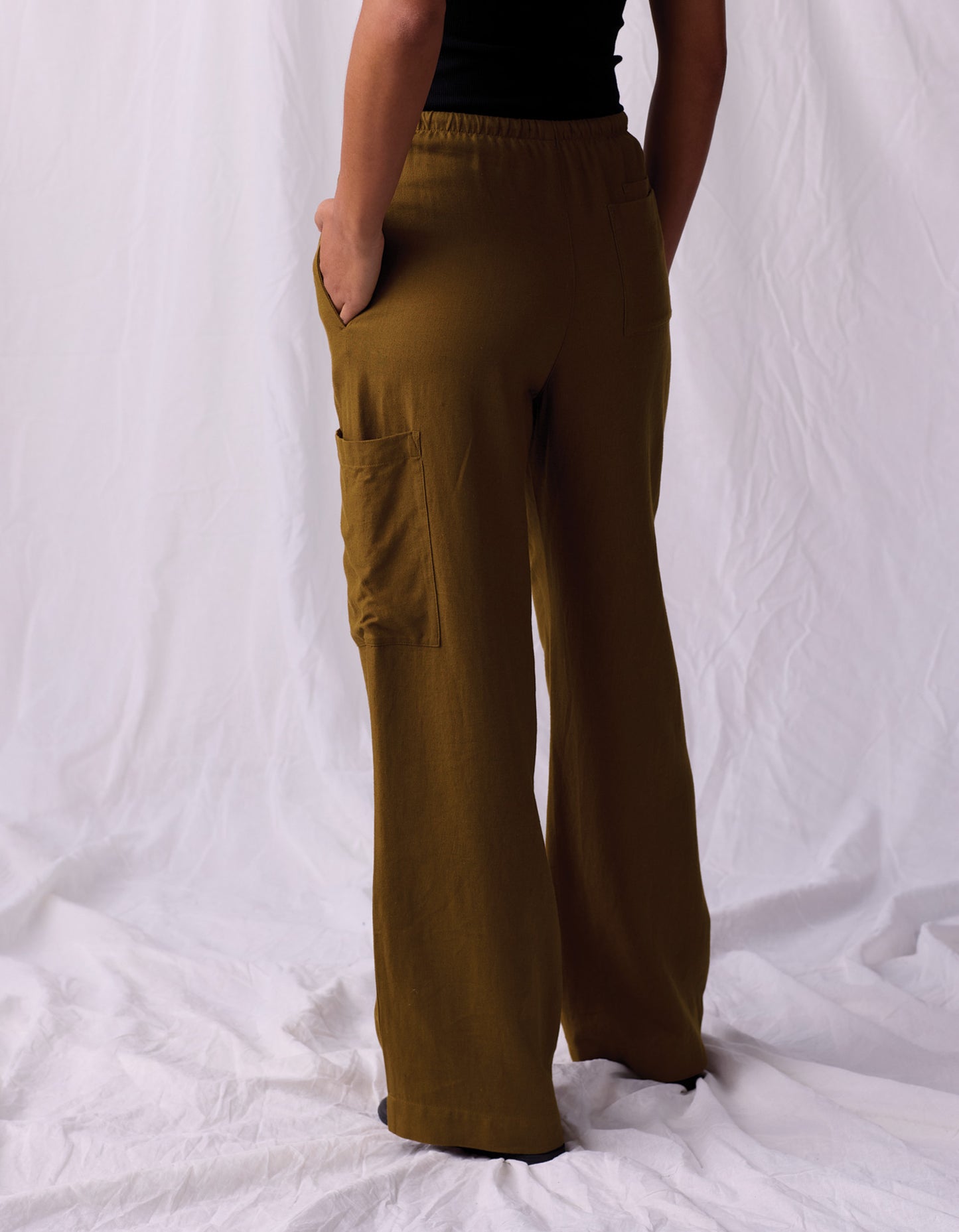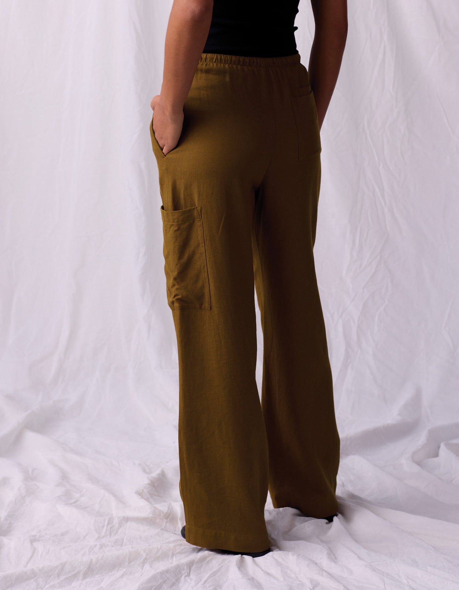 Comfort meets versatility. Crafted from a smooth and drapey mid-weight blend of 75% viscose and 25% linen, this pant is breathable and luxurious. Designed with an adjustable elastic waist and drawstring, these pants offer a relaxed fit through the leg and a hi-rise silhouette that can be worn at your preferred height. Features include double back pockets on the left, a cargo pocket on the right, and a tall hem for easy alterations. These full-length pants are perfect for effortless, laid-back styling.