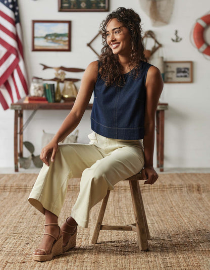 The Denim Mariner Top is a boxy, sleeveless tank that hits at mid-rise, made from 100% cotton lightweight denim with an easy and soft feel. Designed with self-fabric binding at the bateau neck opening, it features a center front seam with single needle stitching and bust darts for a tailored fit. The back neck showcases a keyhole with a button closure, while triangular cutouts at the side hem add unique detail.