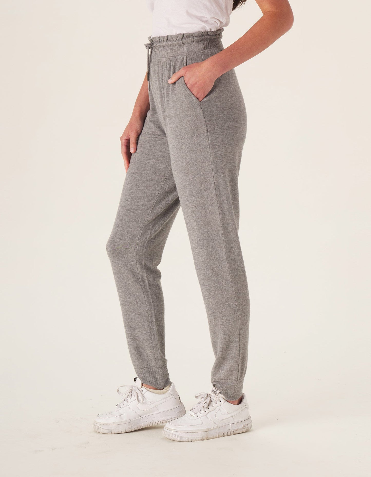 Paper bag waist with drawcord. Ribbed leg cuff and body pocket facings. Single needle topstitching at all seams. Slim leg with ribbed cuff. Hi-Rise - hits at natural waist
