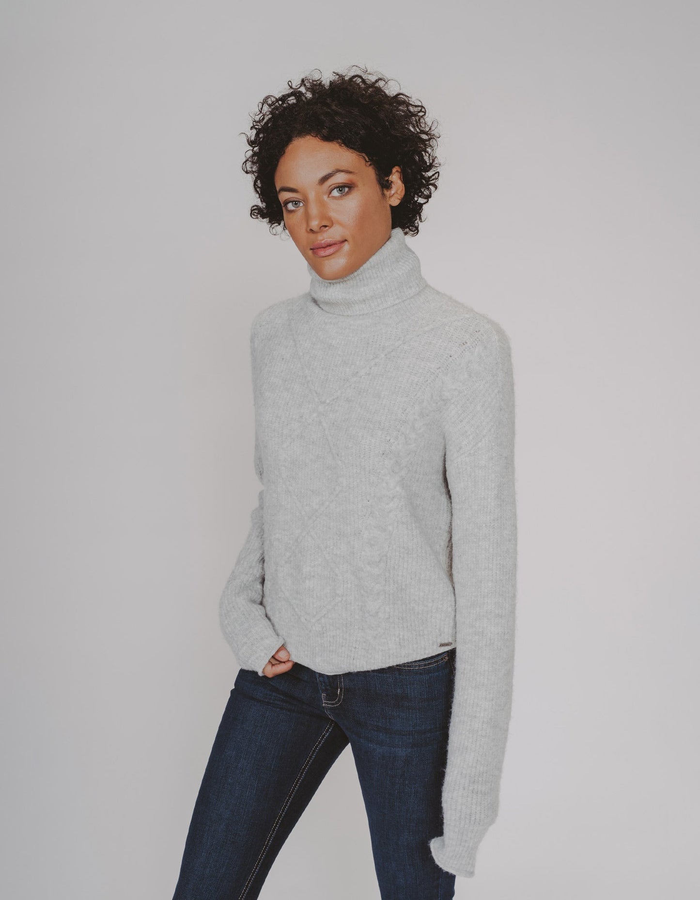 Novelty cable knit at front. Ribbed turtleneck collar, sleeve cuffs and bottom band. Branded metal bar