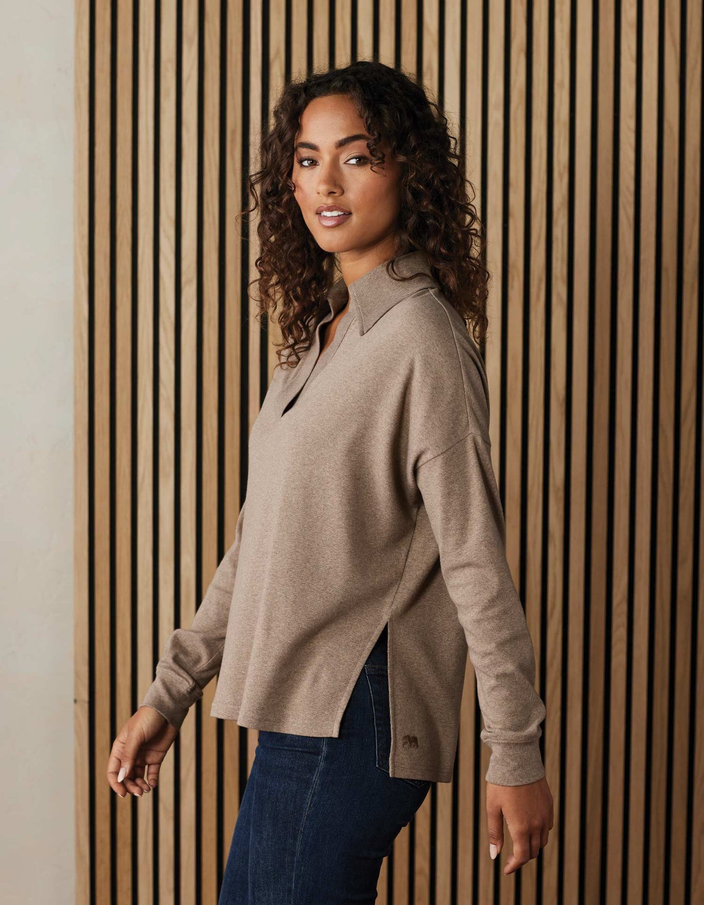 Cozy yet polished. Made in our signature and best-selling Puremeso, this top is garment-washed for a smooth feel. Featuring a boxy fit that hits at the high hip, this polo top includes a rib collar, an open front with a rib placket, dropped shoulders, and long sleeves with rib cuffs. The hi-low hem with side slits ensures a flattering fit.