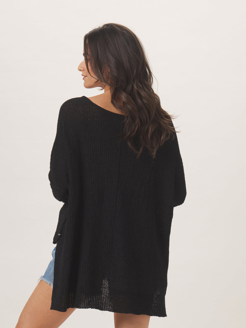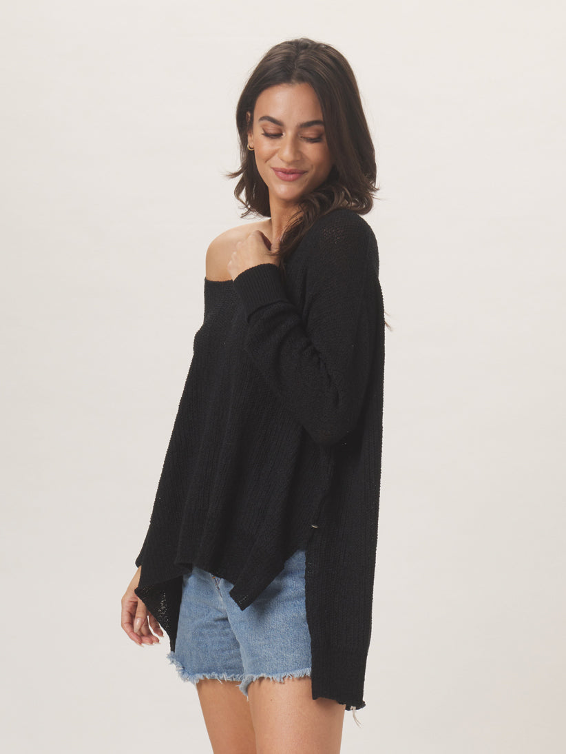 Summer sun, meet summer grunge. The Roadtrip is a soft, drapey, ultra lightweight sweater with a soft, gauzy texture. With fitted sleeves and an oversized fit, it can be worn both on and off the shoulder. Pair it with your favorite pair of sunglasses, loud music, and lots of nerve.