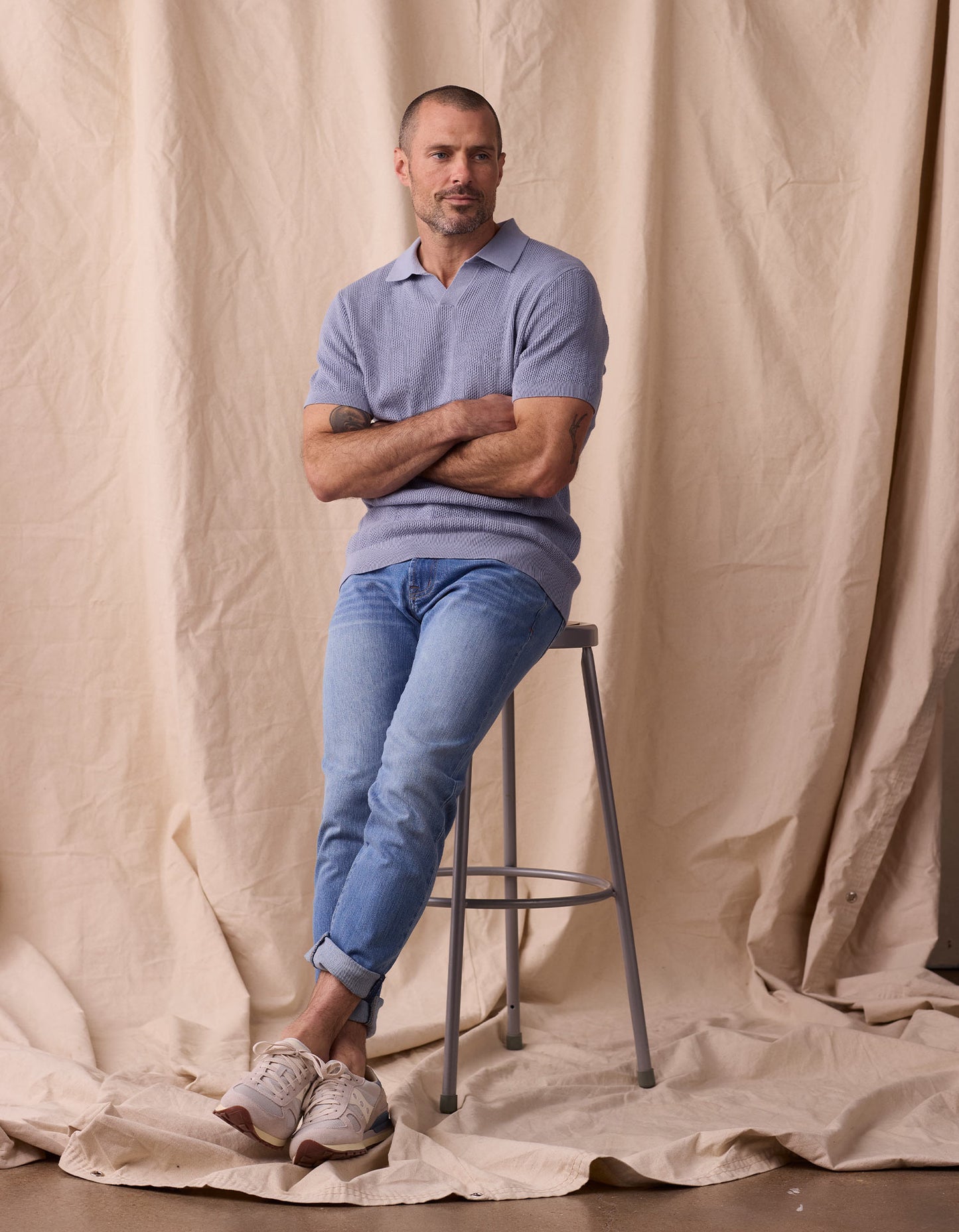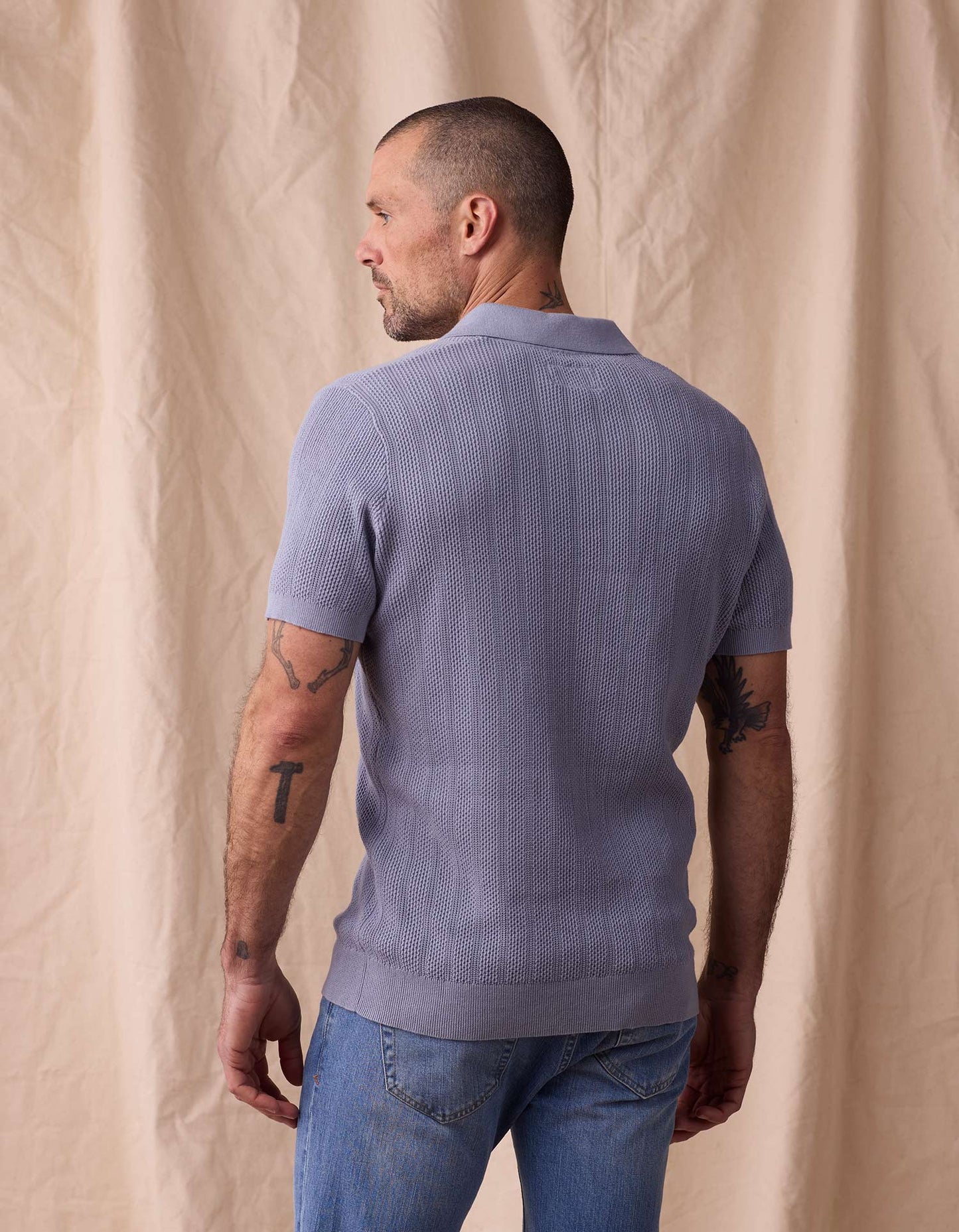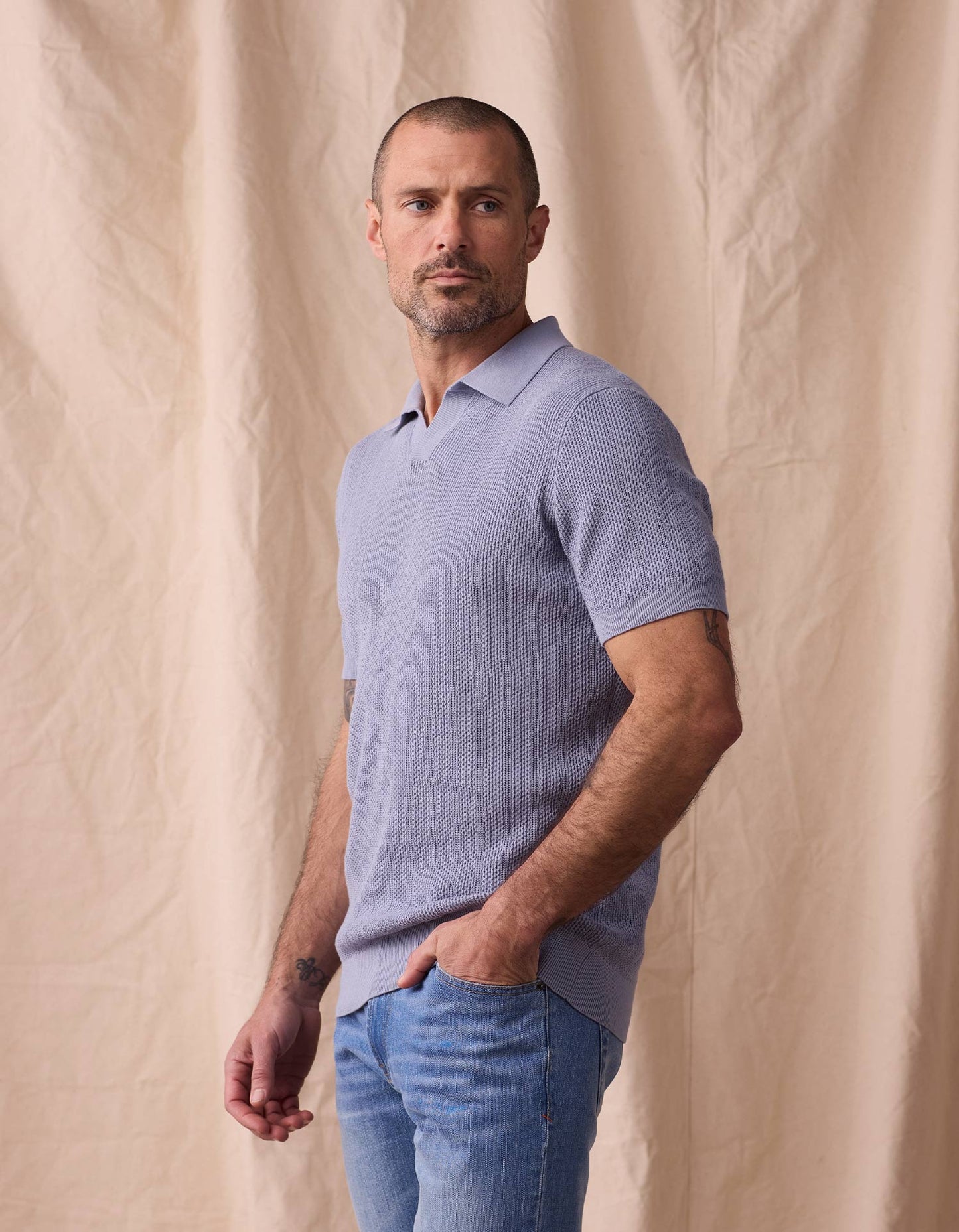 Vintage charm meets modern comfort. This polo is a true-to-size, lightweight knit shirt made from 100% Cotton Robles Yarn. It has a soft, classic cotton feel with a subtle stretch and features a novelty textured knit stitch that forms subtle vertical stripes. Key details include a rib collar, a clean, button-free rib center front placket, and inset sleeves with rib cuffs. The rib bottom band completes this refined yet comfortable polo.