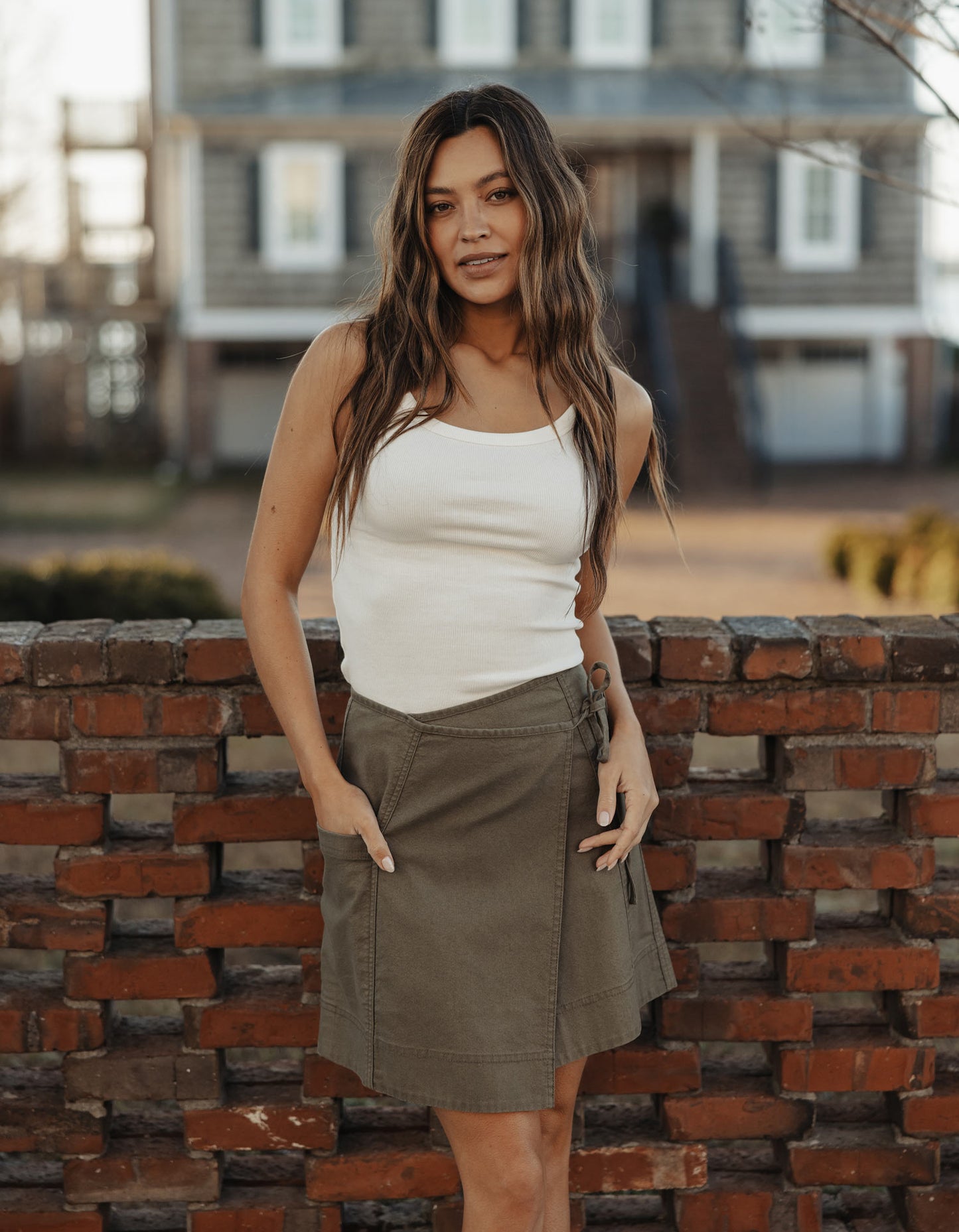 The Scout Canvas Mini Wrap Skirt is a crisp, hi-rise style in a mini length. Made from a heavyweight blend of cotton and spandex, it has a structured, slightly dry canvas handfeel with a subtle stretch. This true wrap design includes self-fabric binding and ties at the waist, plus a hidden button for secure fastening. Asymmetric paneling and a pocket on the wearer’s left side add both function and flair.