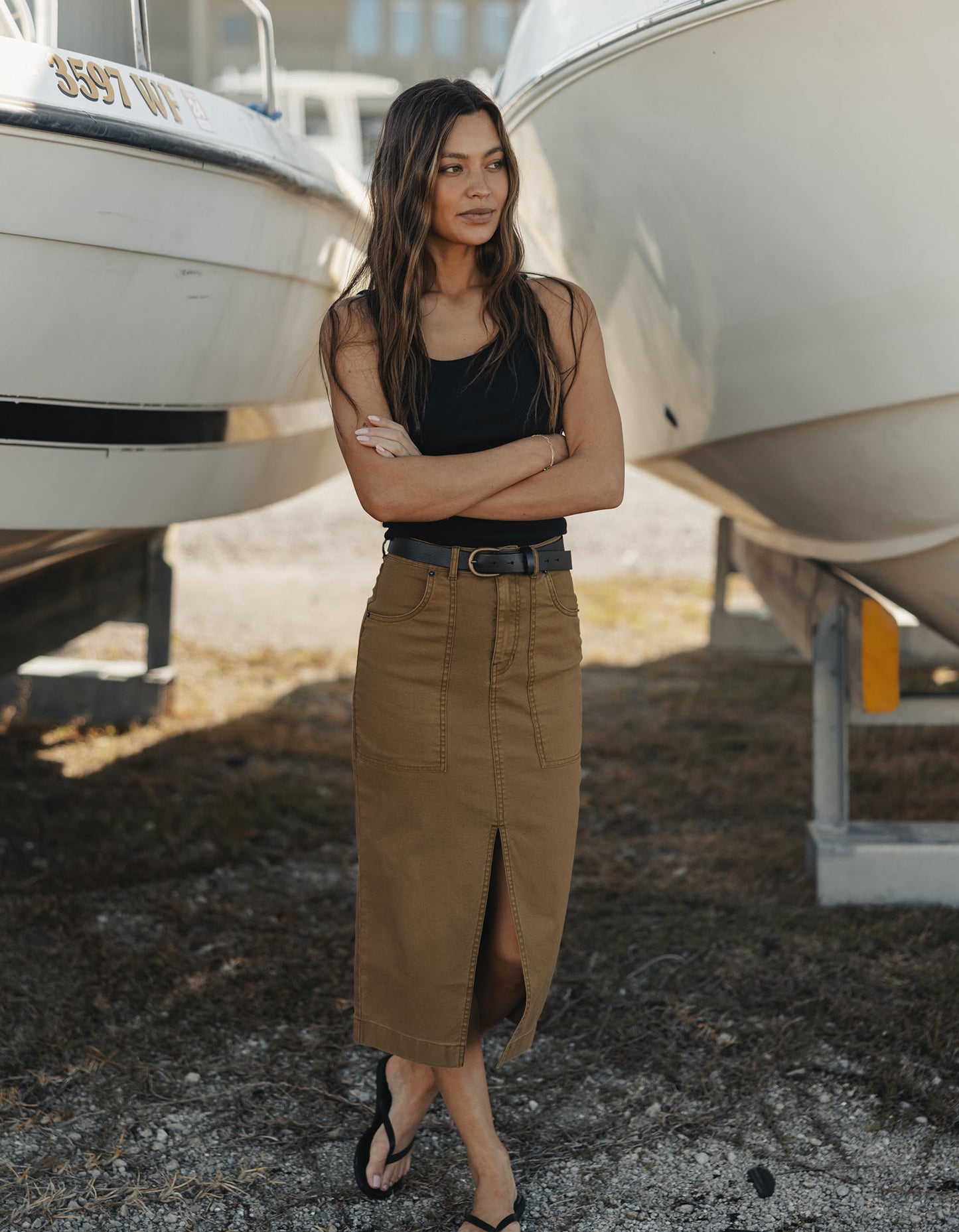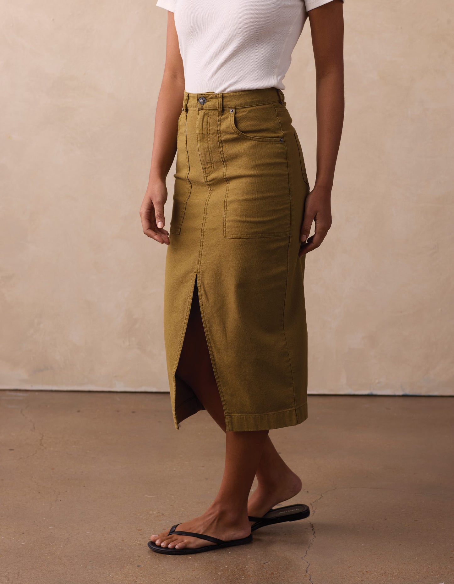 The Scout Canvas Shipyard Skirt merges function and style with a midi-length silhouette, perfect for everyday wear. Made from a heavyweight blend of cotton and spandex, it has a structured, slightly dry canvas handfeel with a subtle stretch. The hi-rise waist and true-to-size fit create a comfortable yet structured look. Details include a contoured waistband, zip fly with center-front button, belt loops, plenty of pockets, a front slit, and a tall hem for easy alterations.