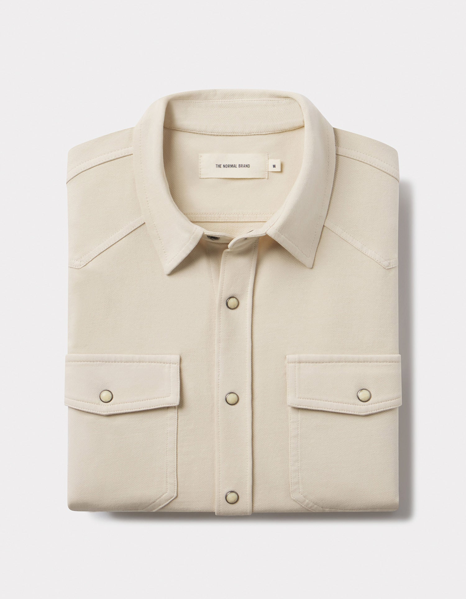 Shirt collar, western yoke detail, 2 chest pockets with snaps, adjustable sleeve cuffs with placket, full snap front, shirttail hem.