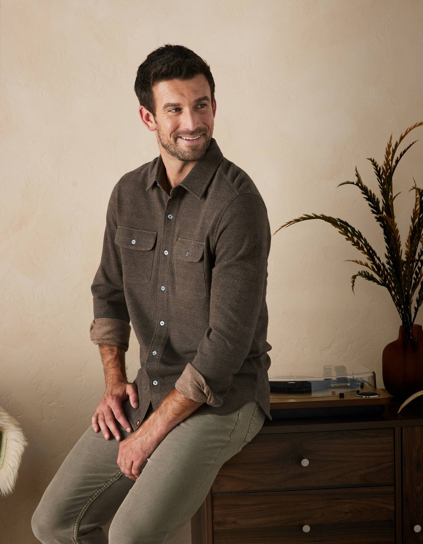 The Textured Knit Shirt is a true-to-size staple made from 100% cotton with a terry-textured herringbone knit. Designed with durability in mind, it features double needle stitching along the sleeve and side seams. A chest pocket with flap and button entry, long sleeves with double barrel cuffs, and a shirttail hem offer a classic, functional finish. Engraved buttons add a subtle branded touch to this elevated everyday layer.