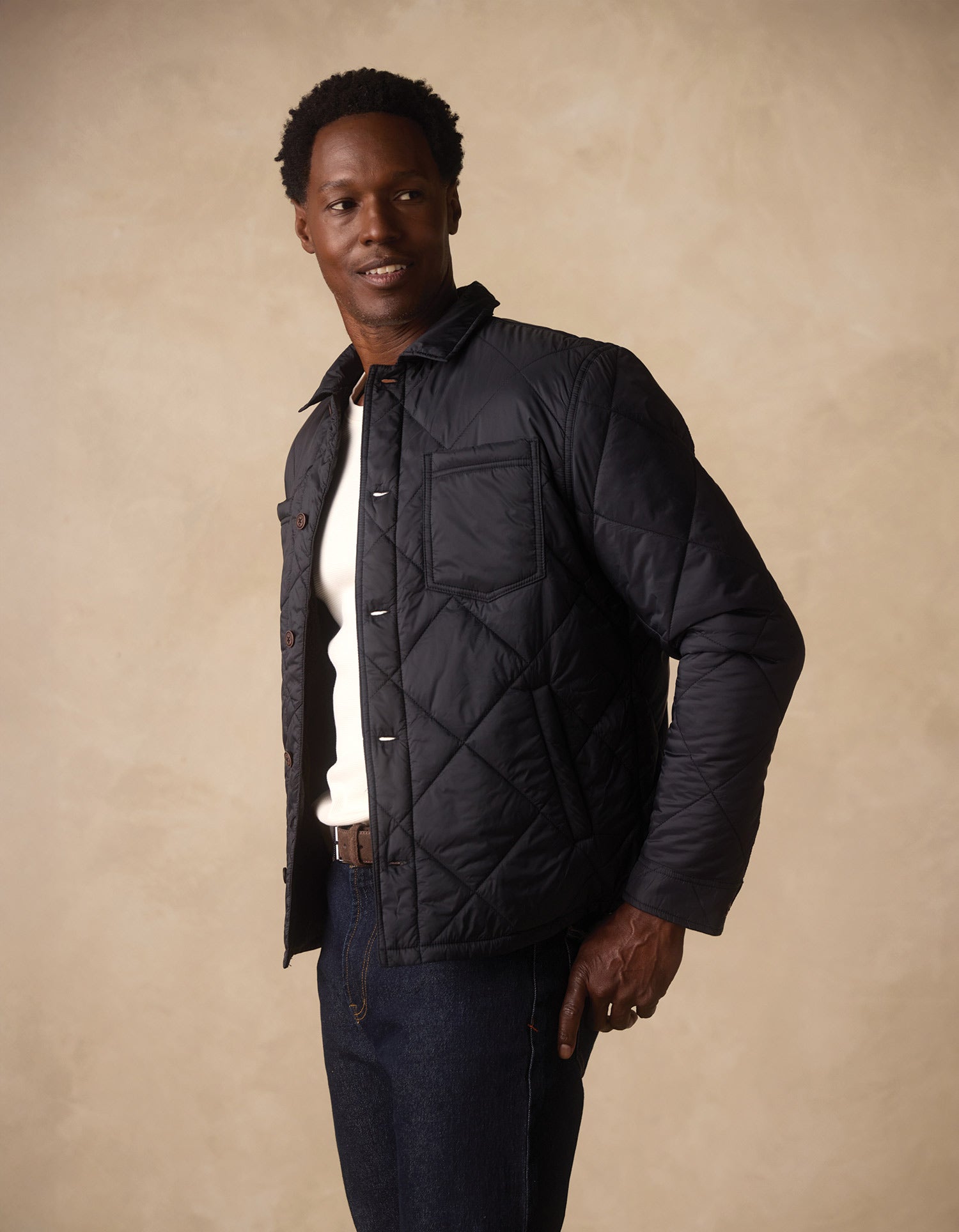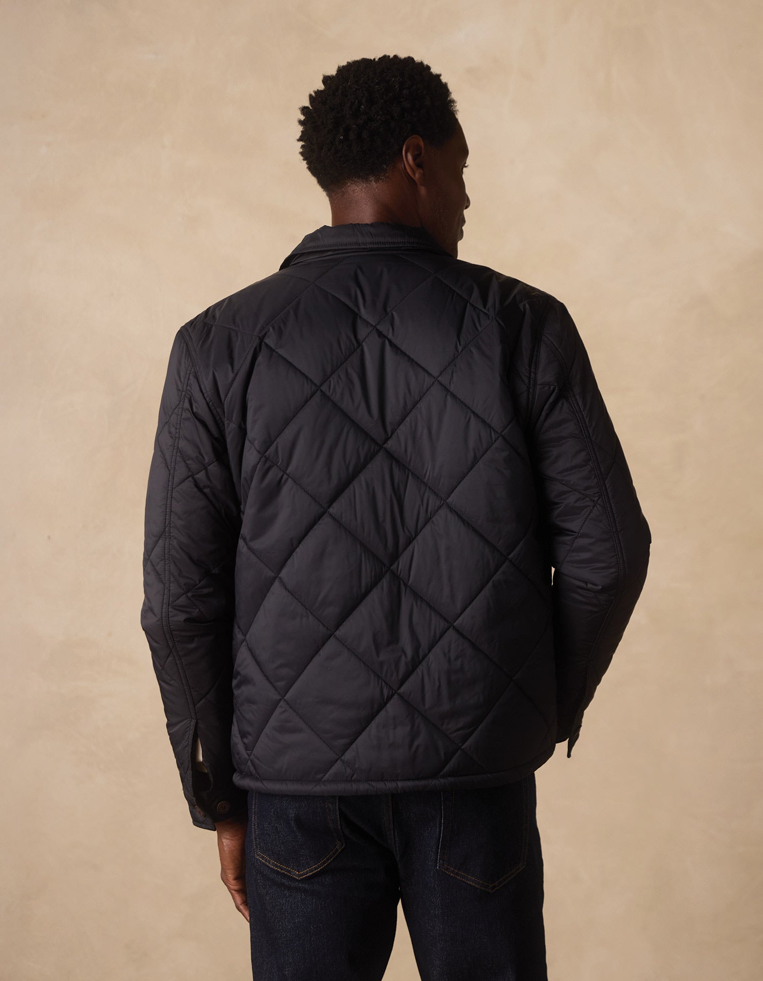 Unquilted shirt collar. Full button front. Large diamond quilting. Unquilted chest patch pockets. Adjustable sleeve cuffs. Unquilted single welt body pockets. Faux Wood Buttons. Suede country outerwear label. Signature tape hanger loop.