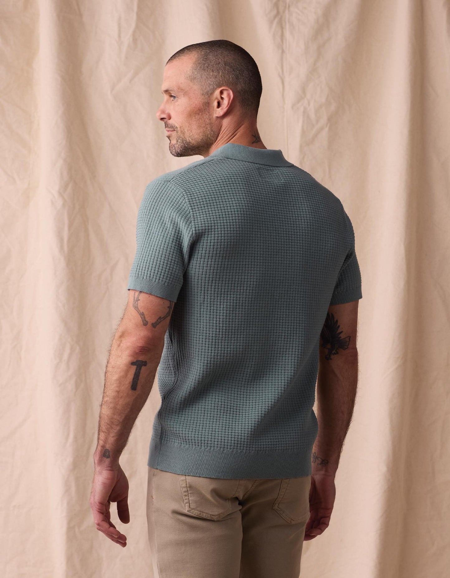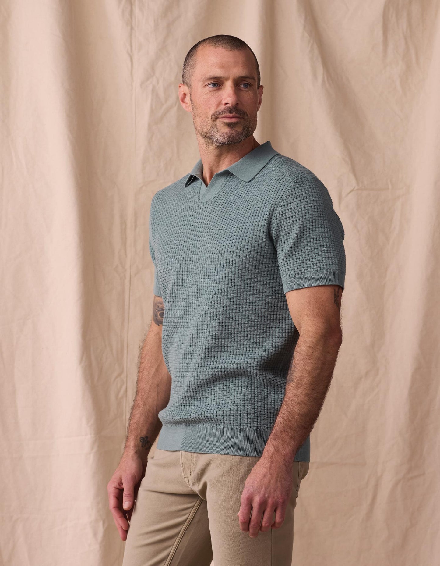 Textured and airy. Constructed from a waffle sweater knit, this polo boasts a breathable textured design. The rib collar, sleeve cuffs, and bottom band not only add dimension and enhance the classic look. Whether you're dressing up for an occasion or keeping it casual, this polo effortlessly combines comfort with a touch of sophistication.