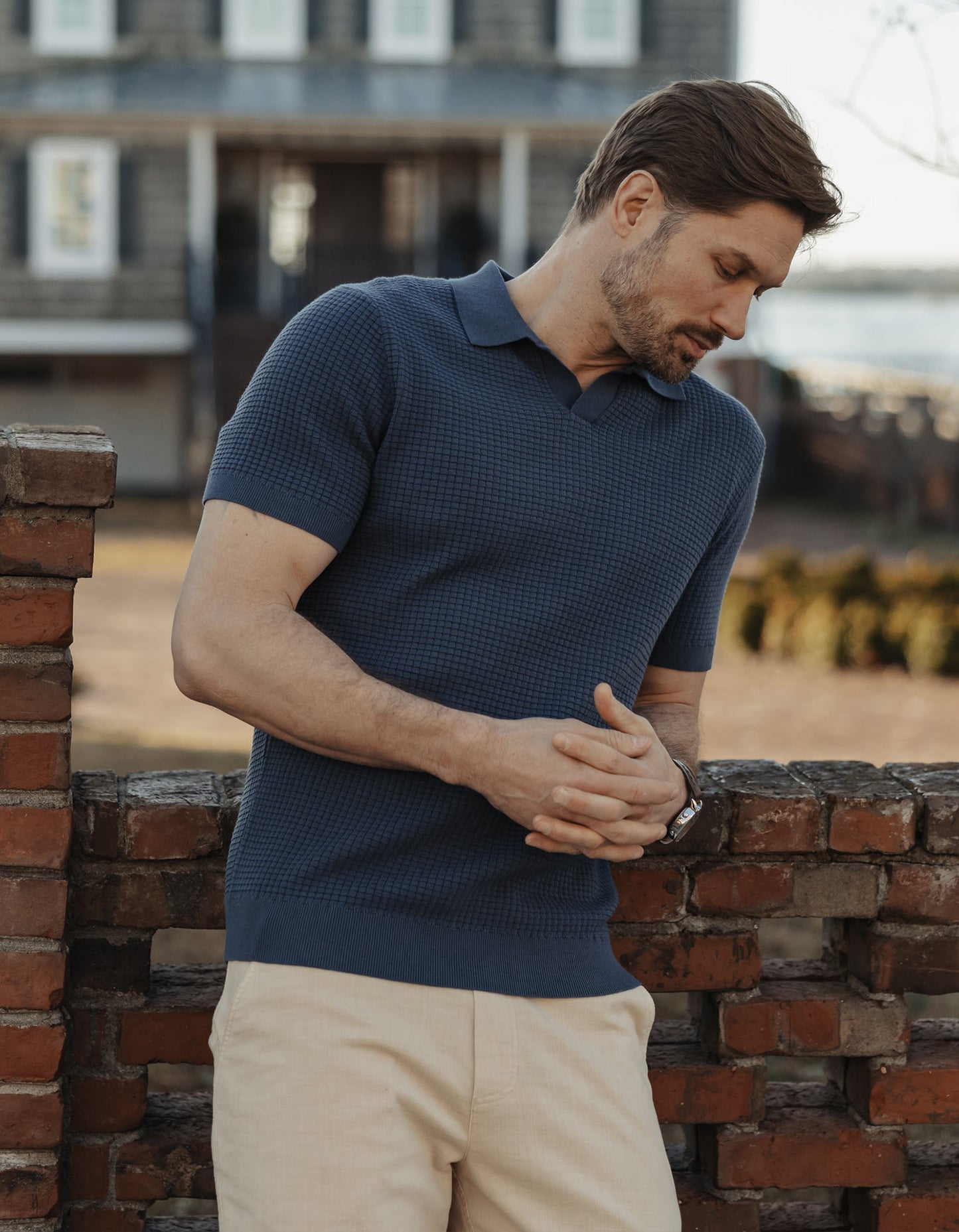 Textured and airy. Constructed from a waffle sweater knit, this polo boasts a breathable textured design. The rib collar, sleeve cuffs, and bottom band not only add dimension and enhance the classic look. Whether you're dressing up for an occasion or keeping it casual, this polo effortlessly combines comfort with a touch of sophistication.