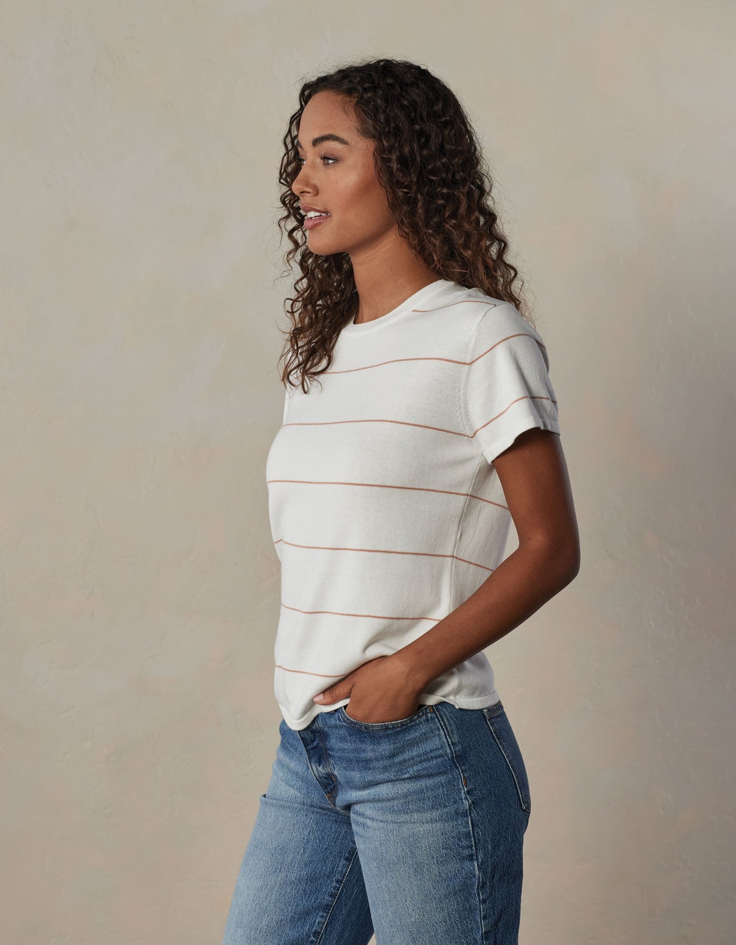 Crafted from a soft and smooth, fine gauge jersey sweater knit, bringing an elevated feel to a classic tee silhouette. The dainty stripe detailing adds visual interest with a flattering effect. With a length that hits at the hip, this lightweight tee is a versatile wardrobe essential for a casually refined look.