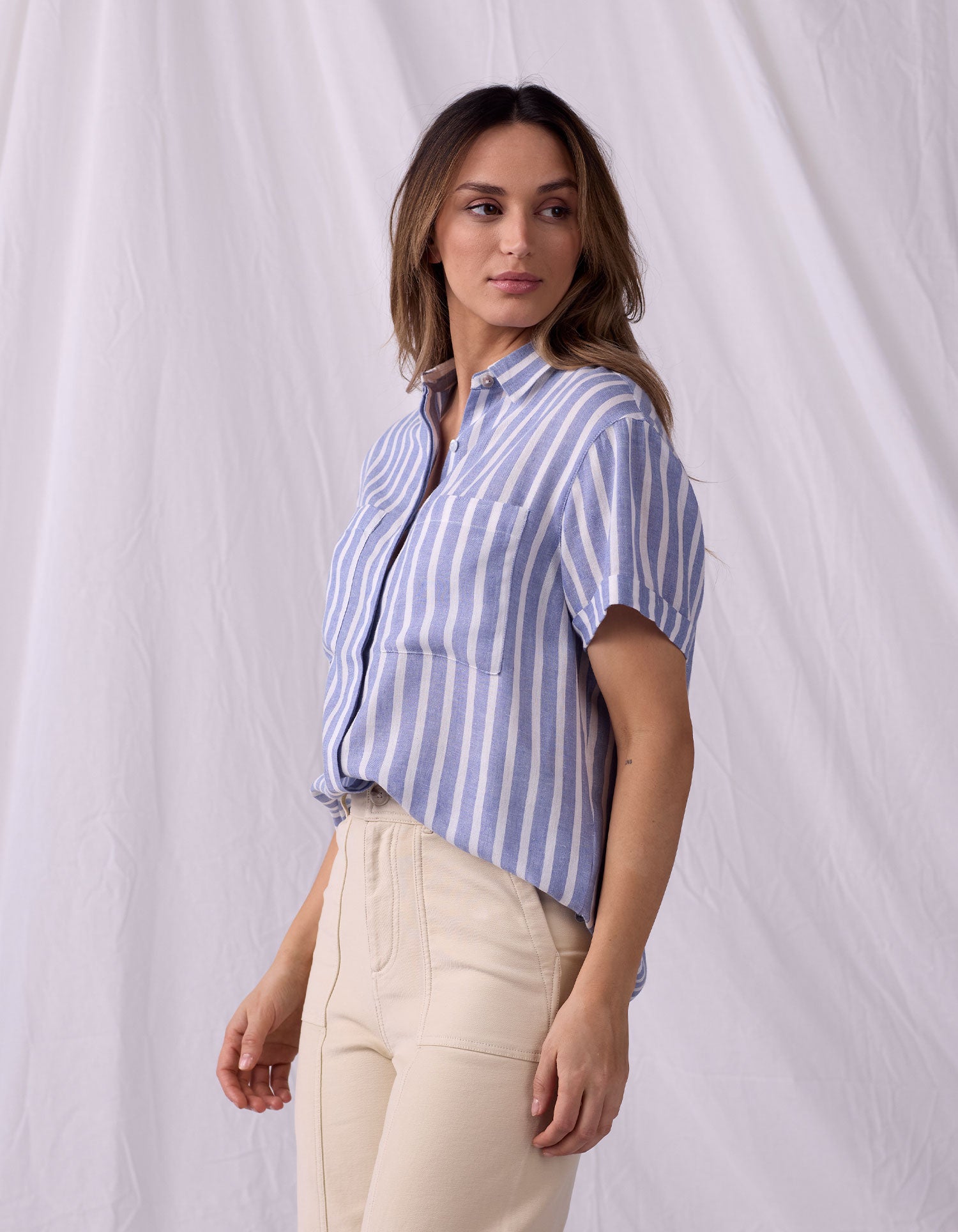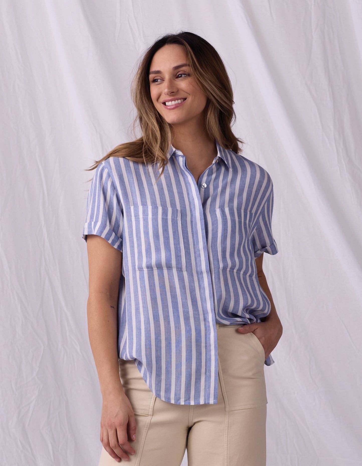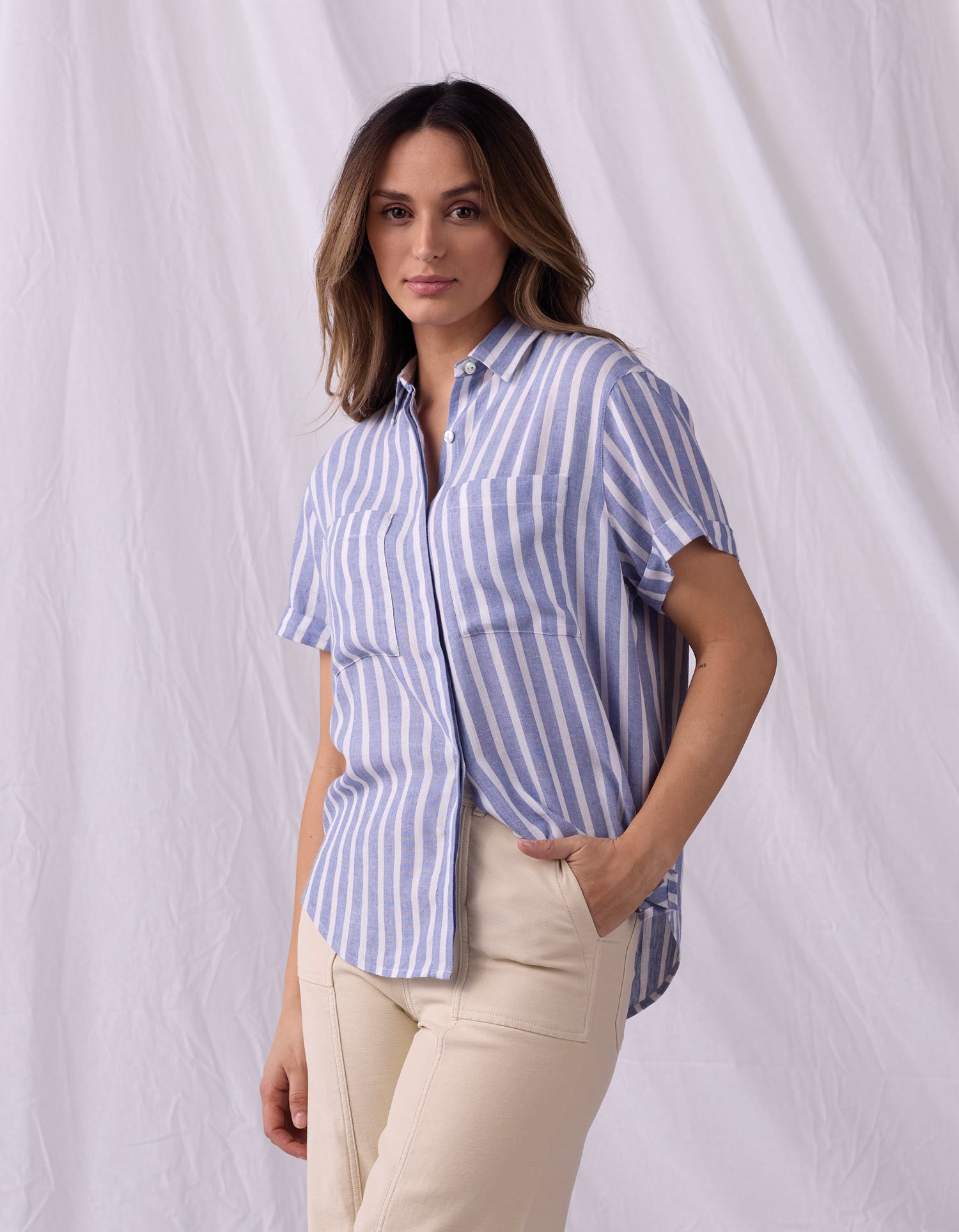 The Freshwater Short Sleeve Button Up is a breezy, boxy top that hits at the hip. The viscose and linen blend gives it an ultra-lightweight and drapey feel. The silhouette features a shirt collar with a collar stand, a hidden button placket, and a back yoke with a box pleat for a relaxed shape. Slightly dropped shoulders, short sleeves with fixed cuffs, two chest pockets, and a shirttail hem add both function and casual flair, making it a go-to piece for effortless everyday wear.