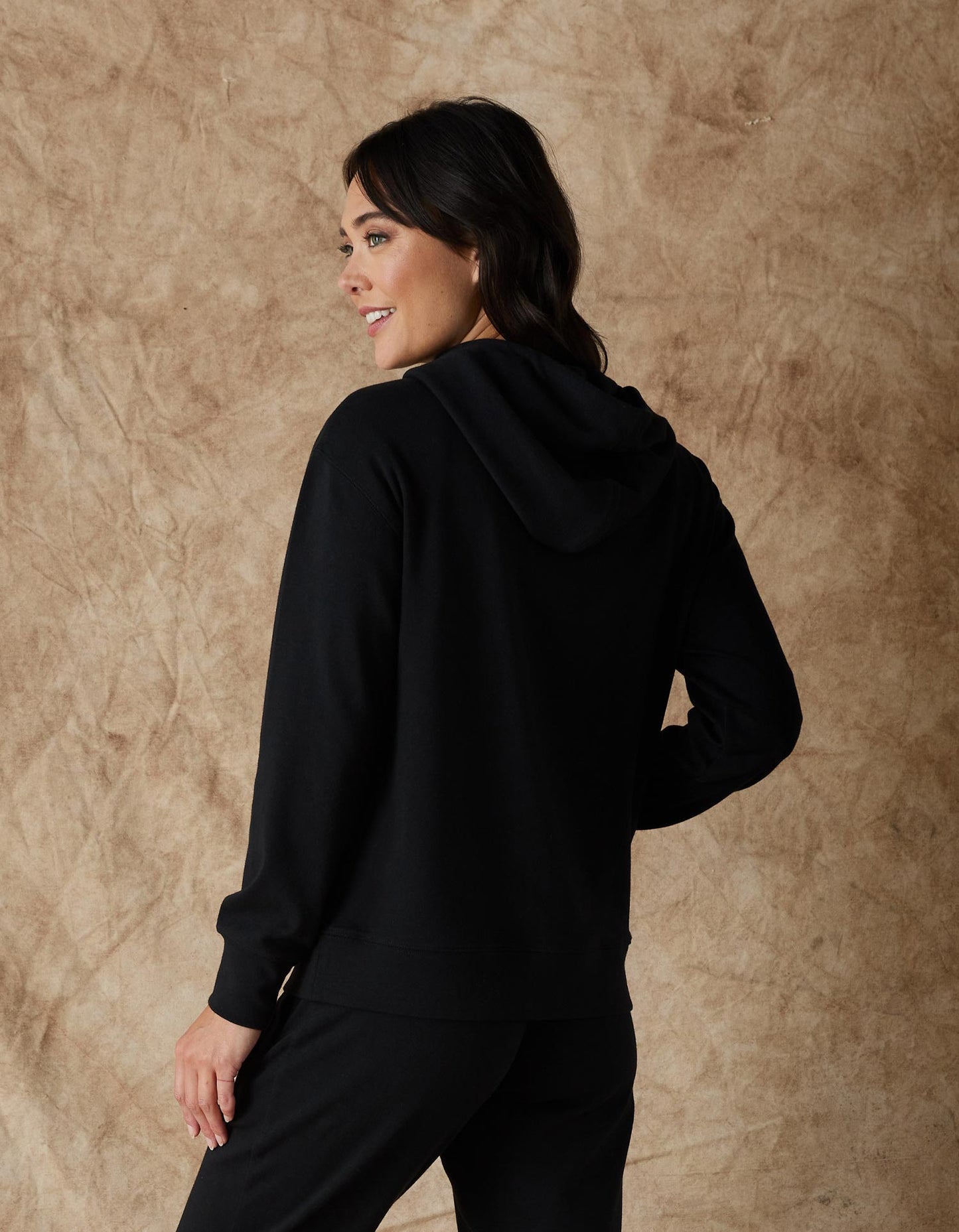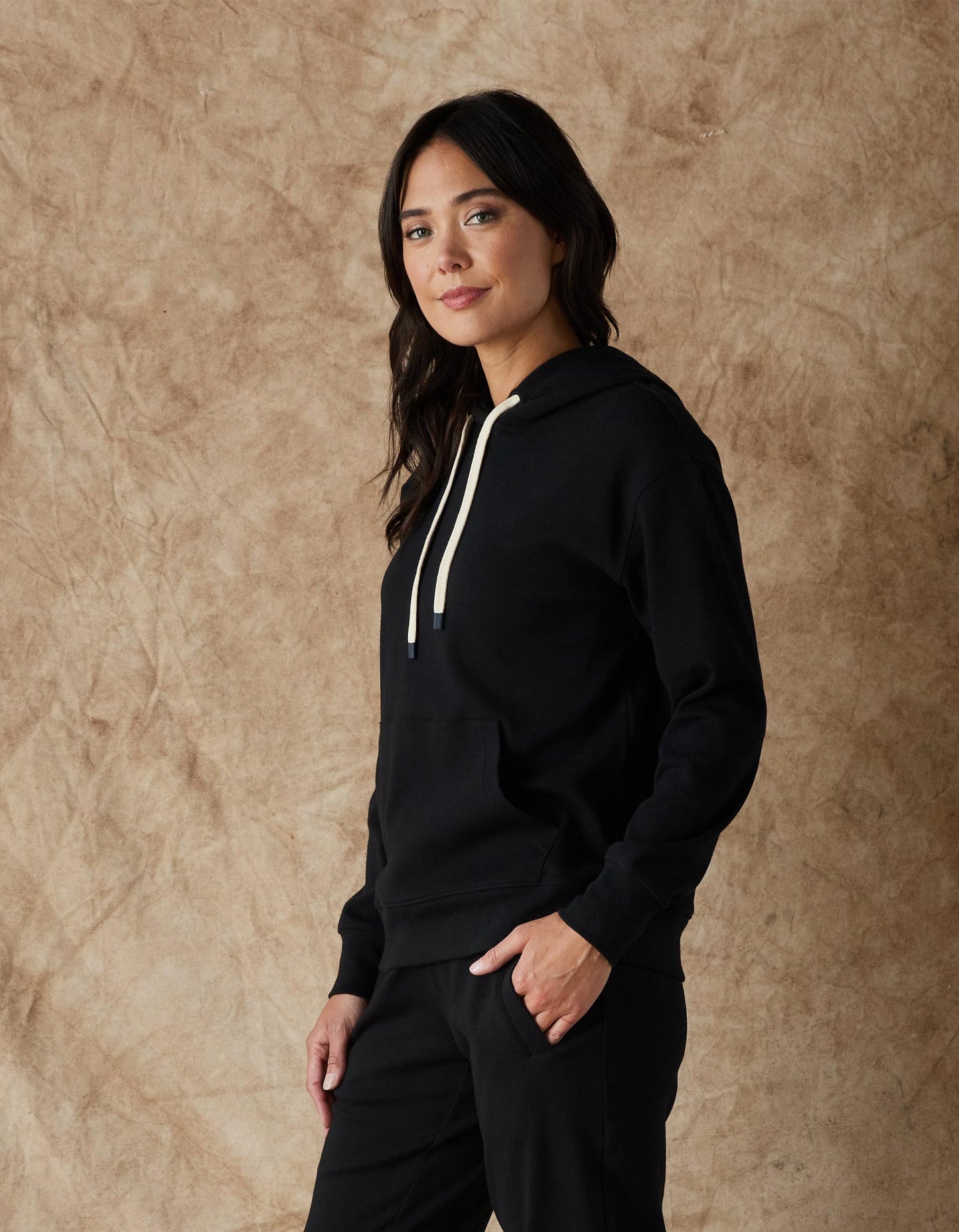 Crafted from our signature and best selling cotton/poly/spandex blend fabric, this hoodie offers unparalleled comfort and all the stretch you need. With a heavier weight and garment-washed finish, it's designed to keep you cozy and warm. This relaxed-fit hoodie hits at the hips, making it a versatile layering piece that effortlessly combines comfort and style for women seeking the perfect blend of fashion and function.